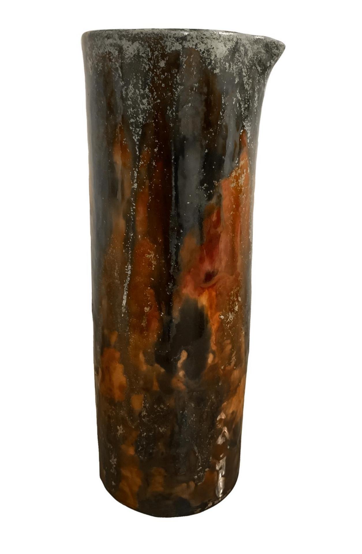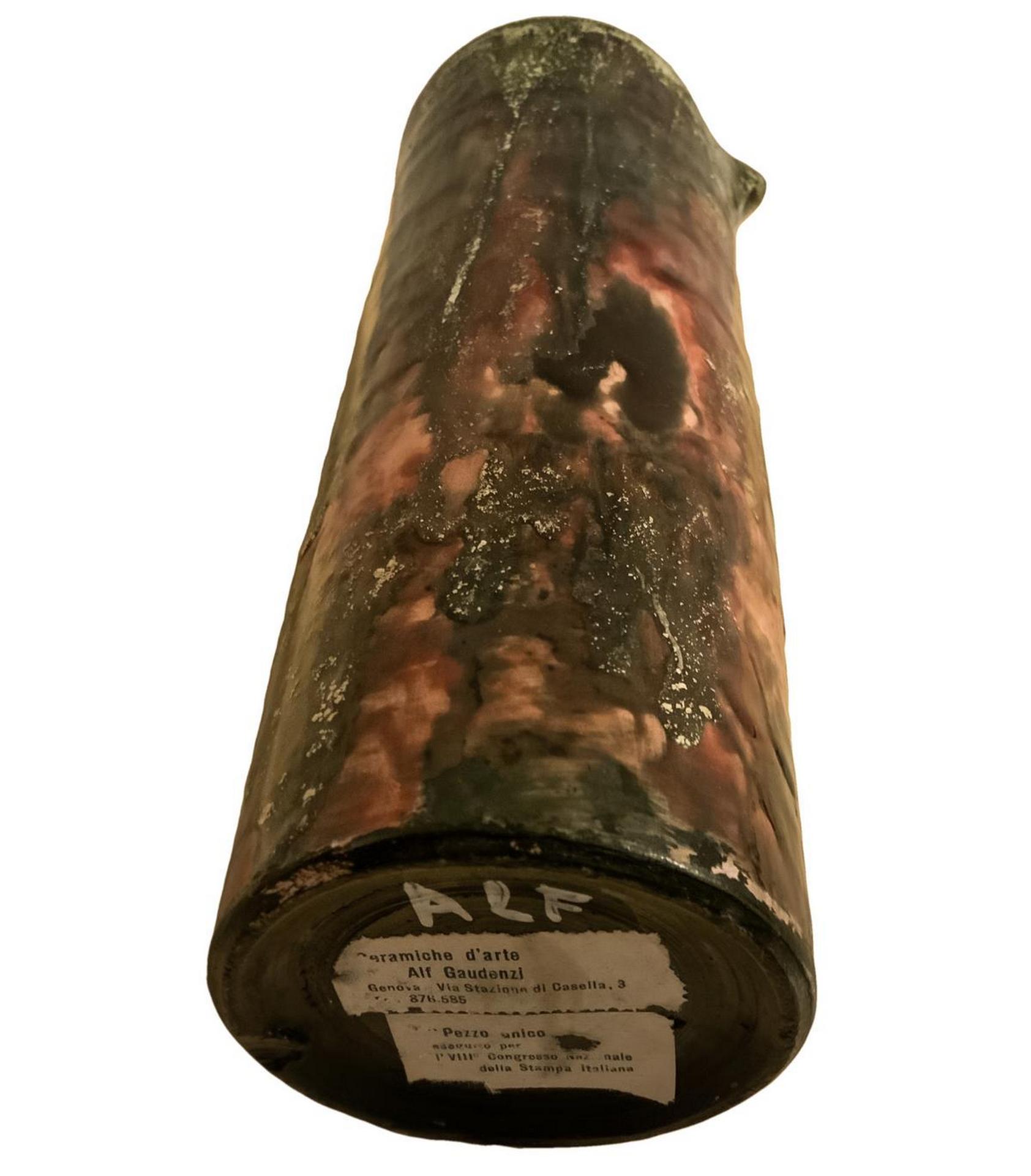 Produzione Alf Gaudenzi. Importante vaso in ceramica di forma cilindrica decorato a smalti colati nei toni del rosa e del verde. Etichetta della manifattura e firma alla base. Anni '50. 22x 9