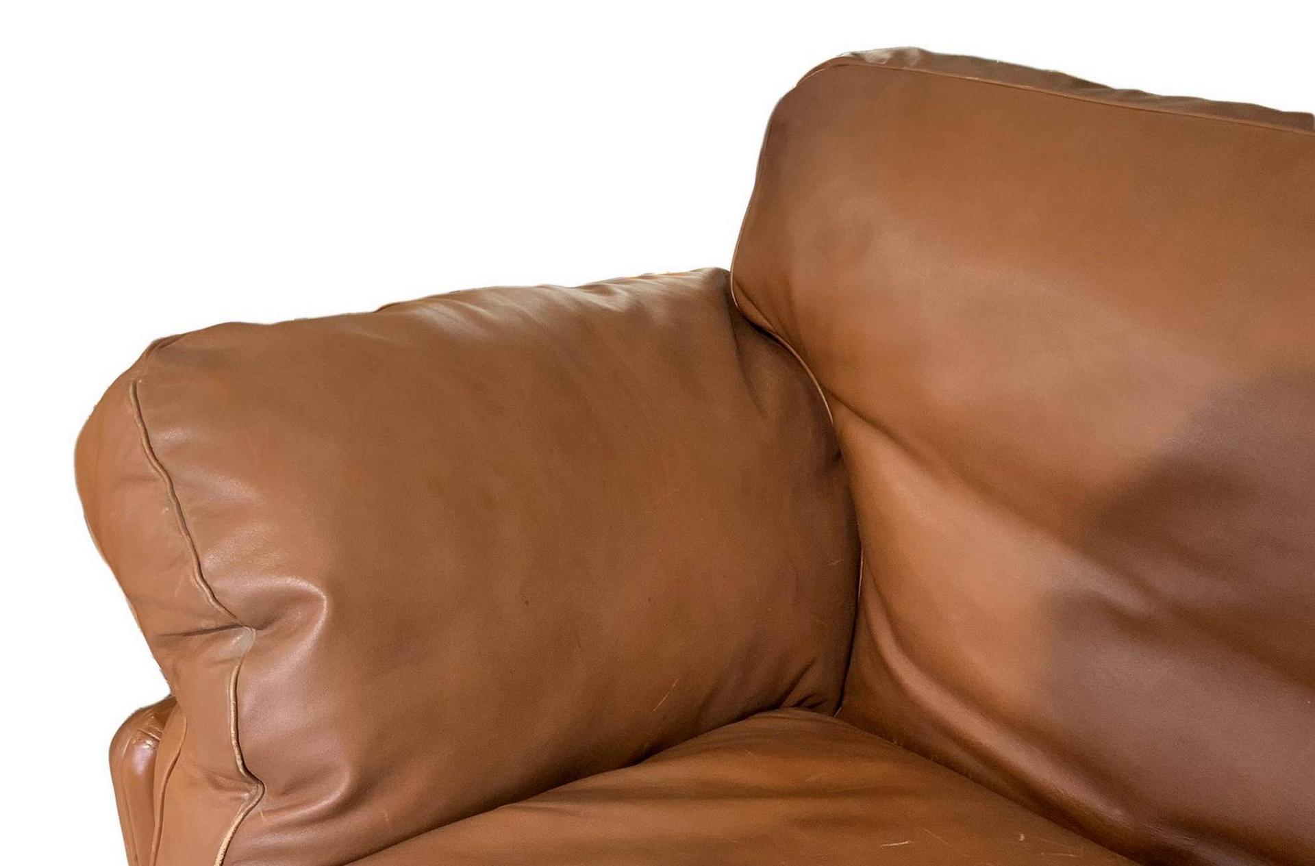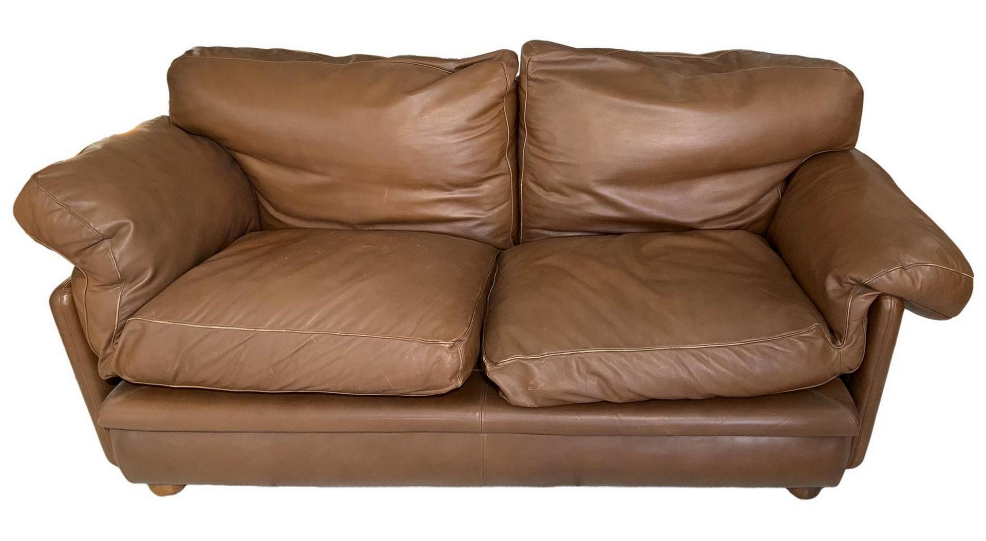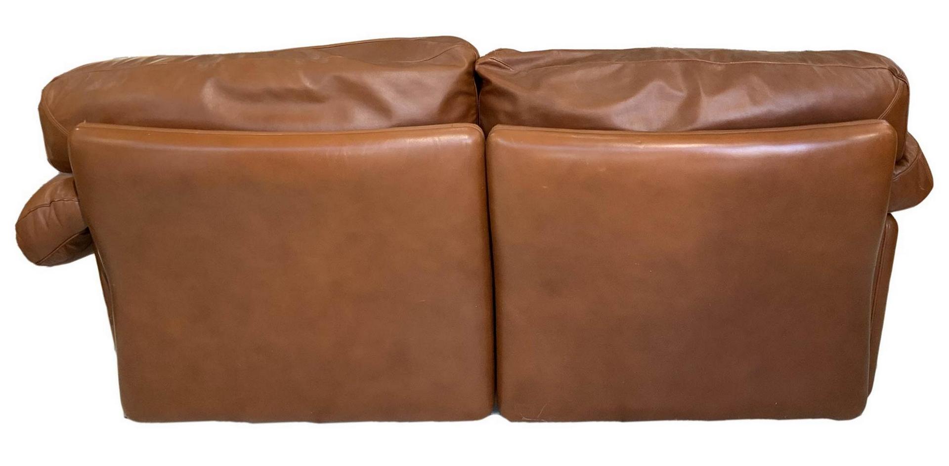 Divano 2 posti modello Poppy anni ’60-’70. Tito Agnoli per poltrona frau. Divano in pelle colore cognac imbottiture in piuma d’oca.