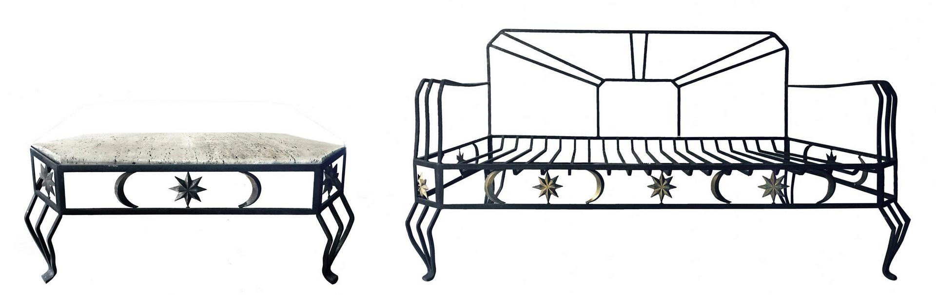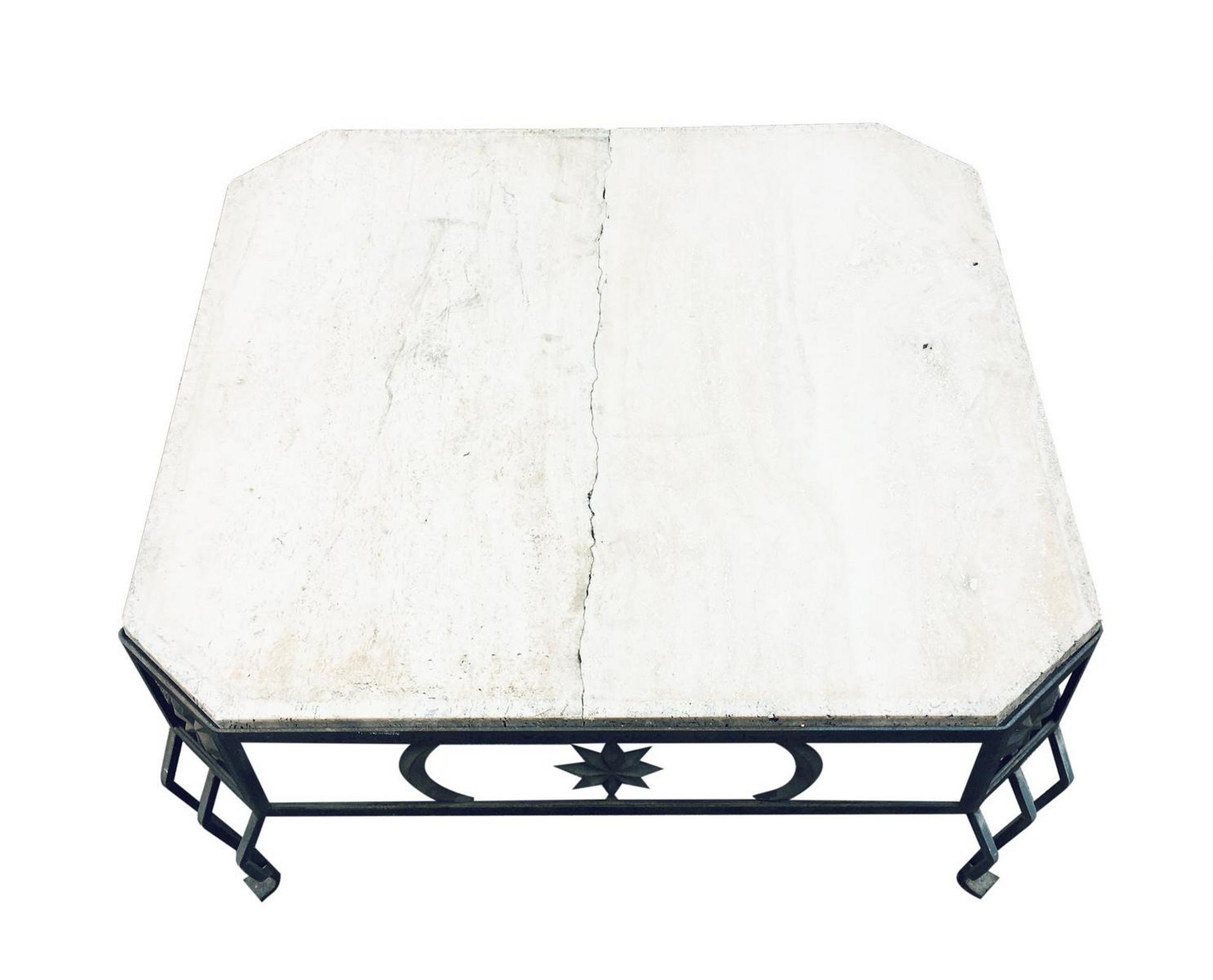 Divano in ferro e tavolinetto in ferro, piano in marmo travertino rotto . Per esterno.