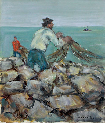 Catarsini Alfredo Lancio della rete olio su tela, cm 50x40 firmato in basso a destra, firmato per autentica, intitolato, timbro con numero di archivio al retro