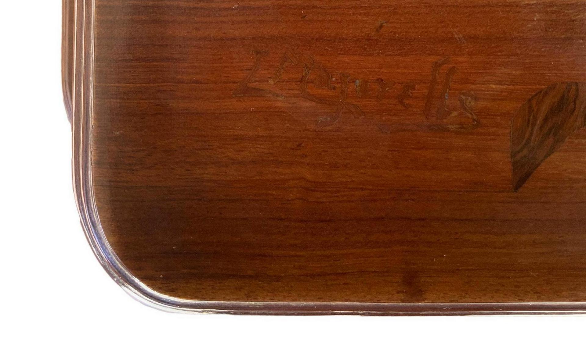 Tavolinetto antico Art Nouveau di Louis Majorelle, Francia, periodo Liberty. In legno con intarsi in legno chiaro. Firmato sull'angolo destro del piano L. Majorelle. H cm 80x85x60