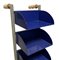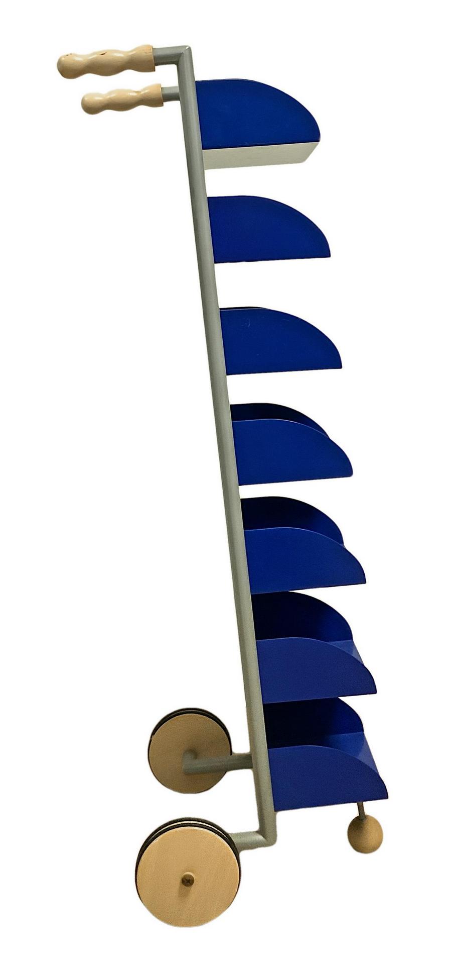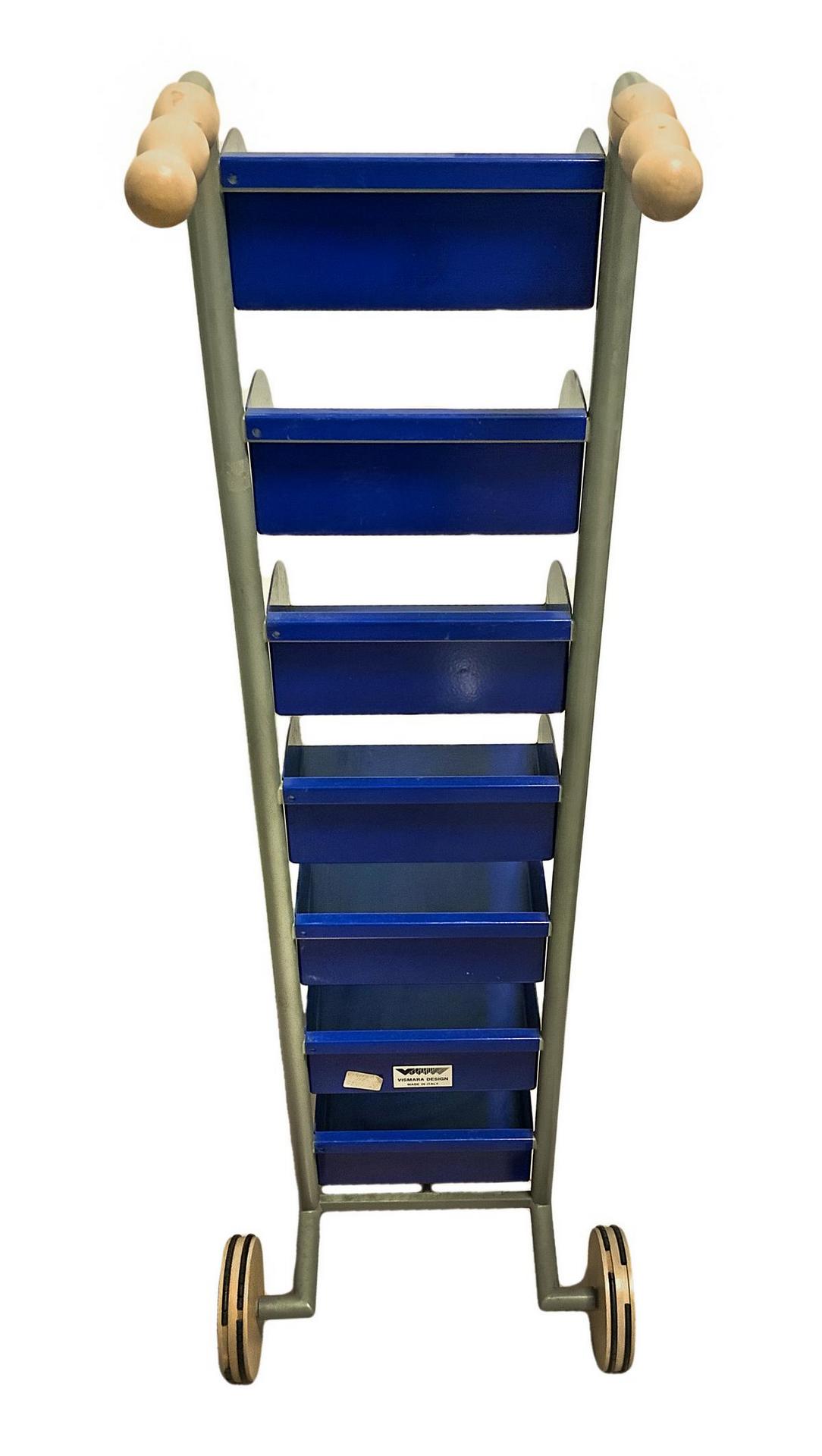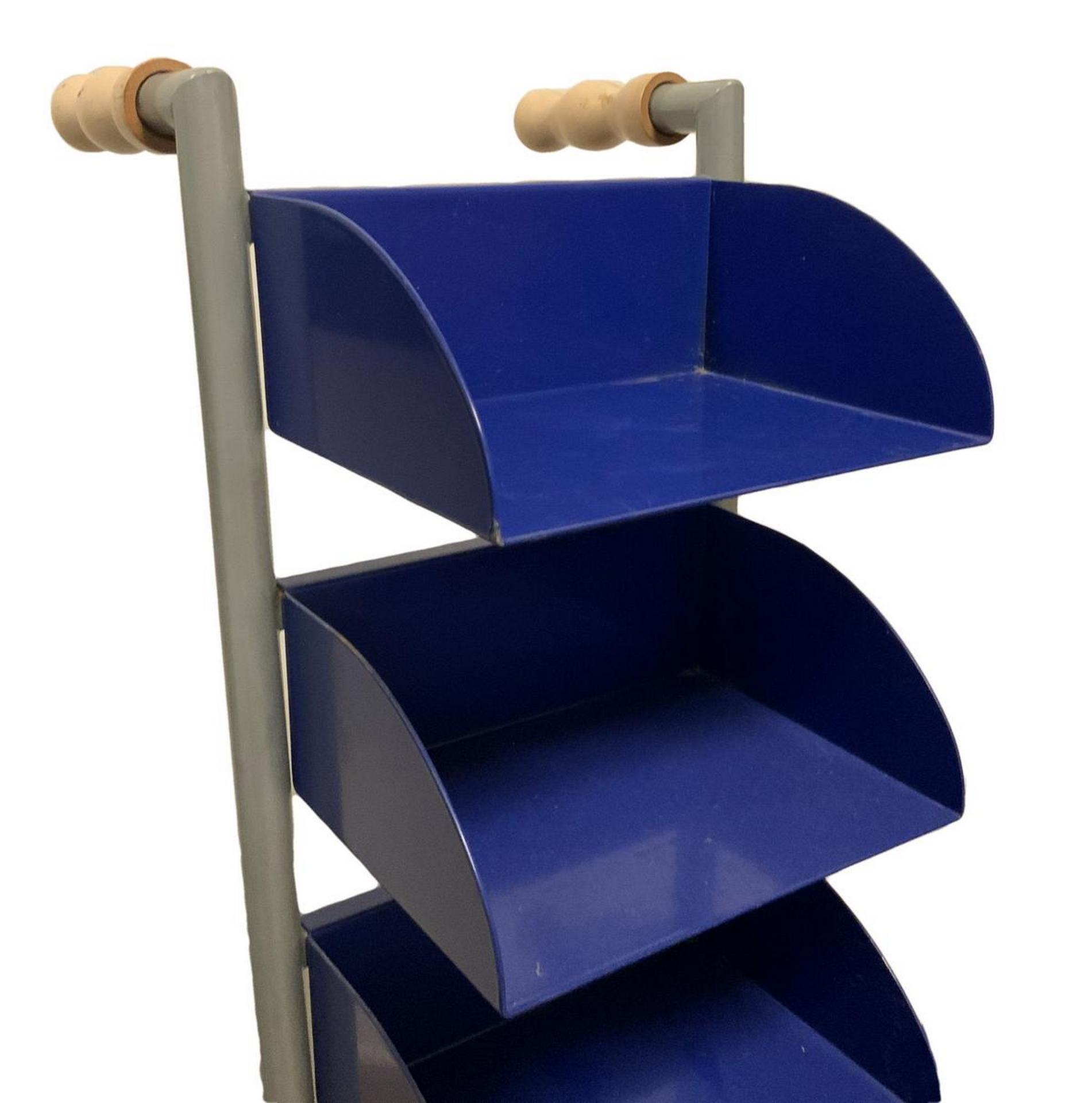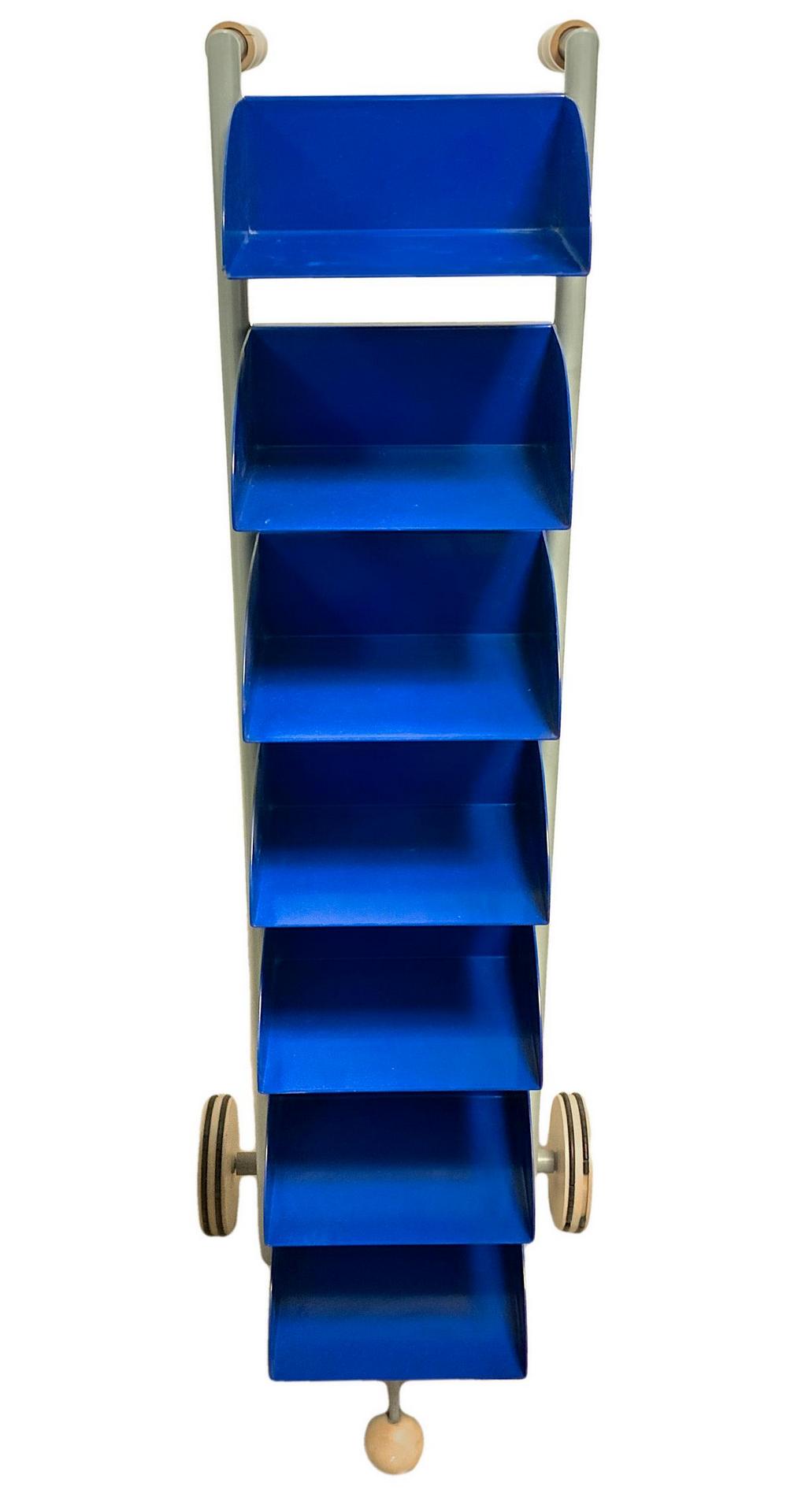 Produzione Vismara, mod Runner. Porta cd in metallo laccato nei toni del grigio e del blu manici in legno, minime mancanze alle rotelle inferiori. Anni '70. 103x23x30
