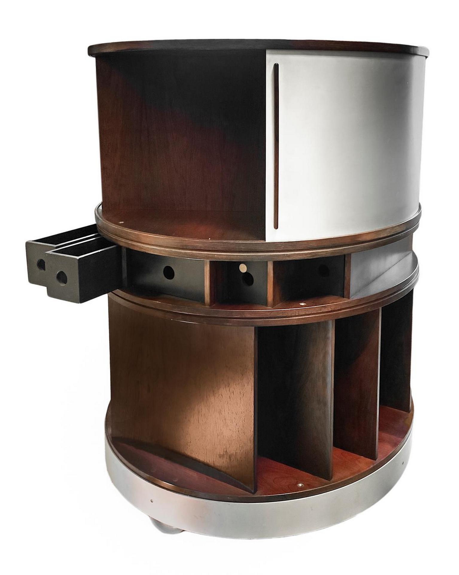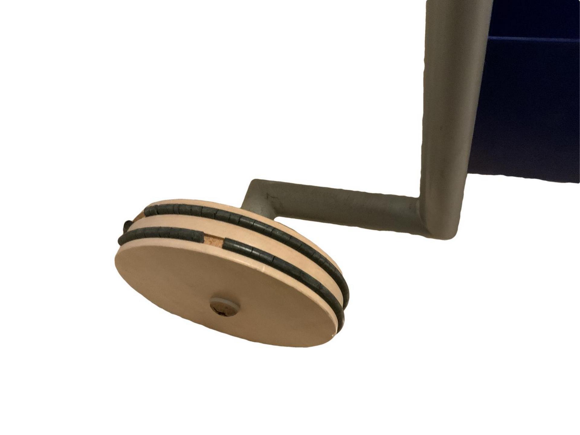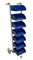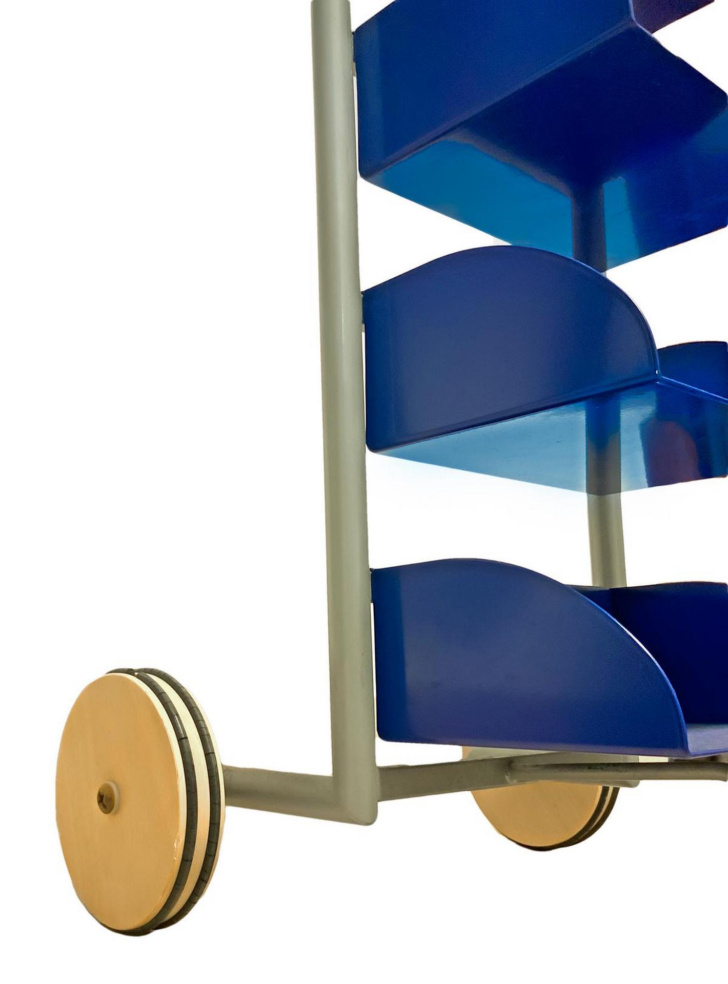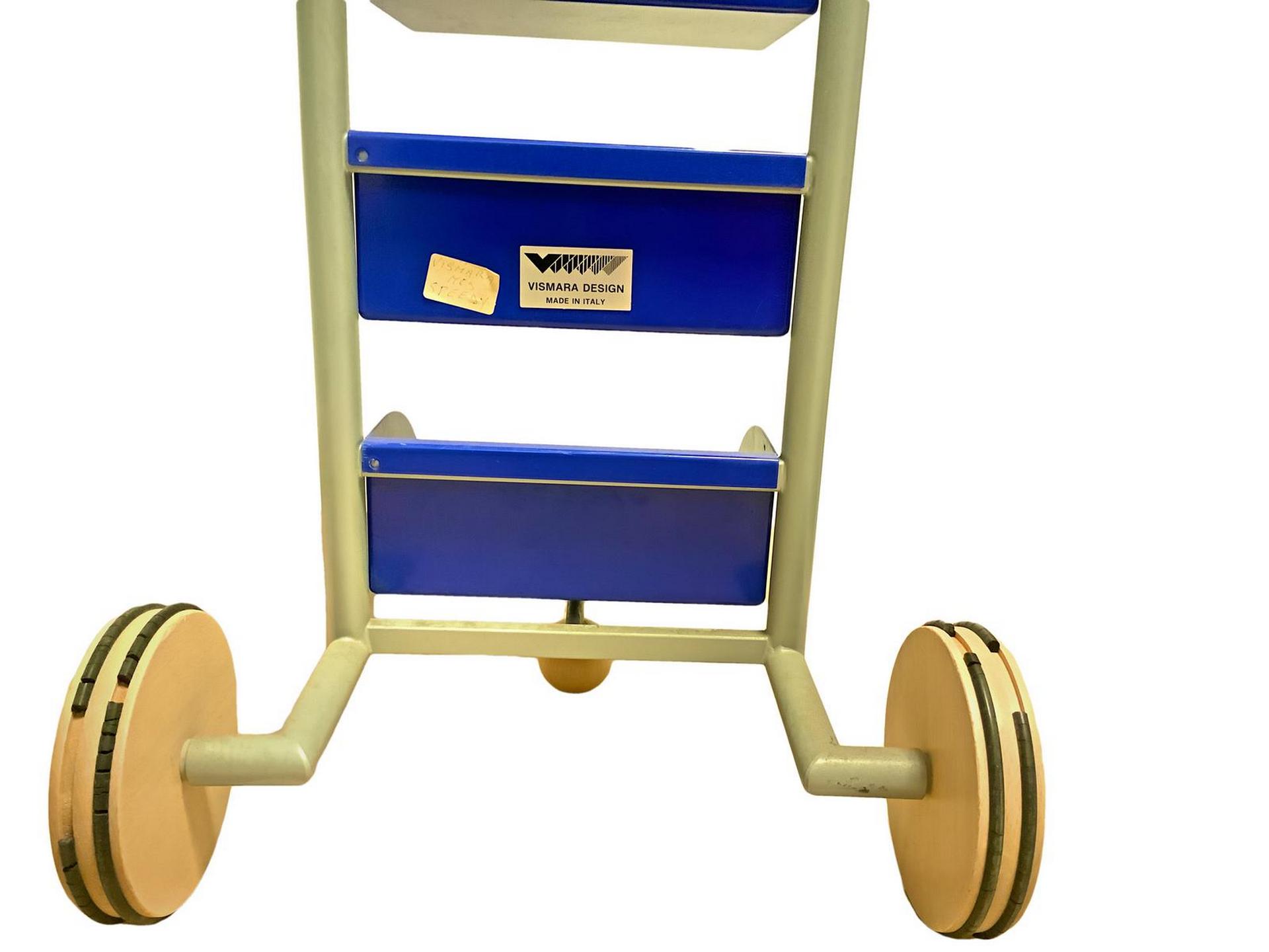Produzione Vismara, mod Runner. Porta cd in metallo laccato nei toni del grigio e del blu manici in legno, minime mancanze alle rotelle inferiori. Anni '70. 103x23x30