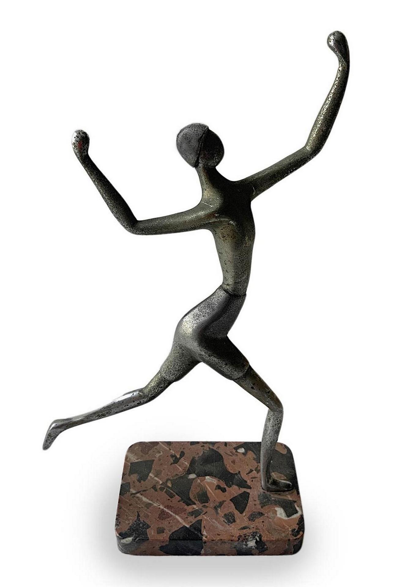 Scultura in metallo cromato raffigurante atleta stilizzato, produzione austriaca, nello stile di Franz Hagenhauer. Base in marmo, segni di ossidazione. Anni 30. Cm 35x23
