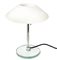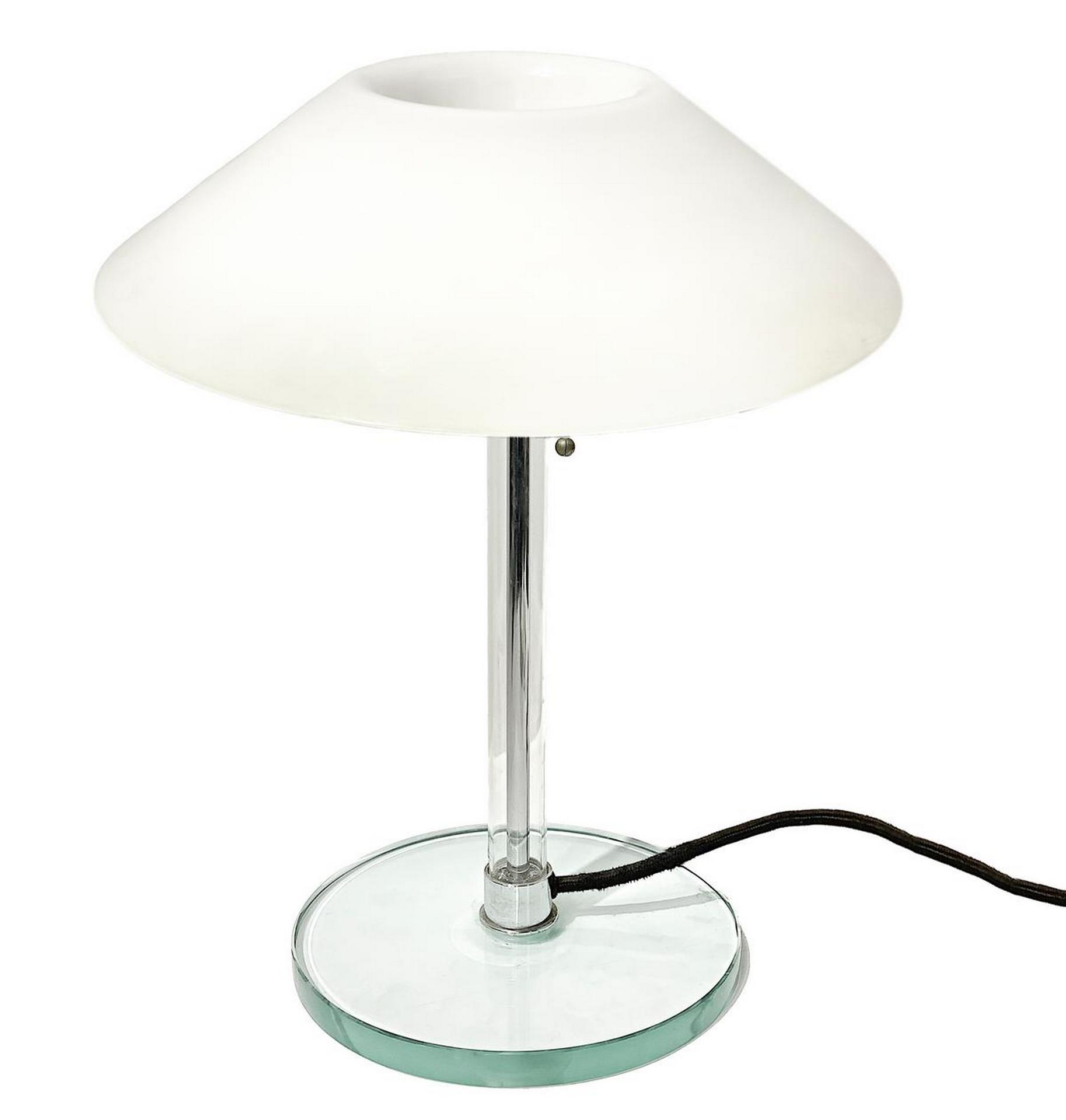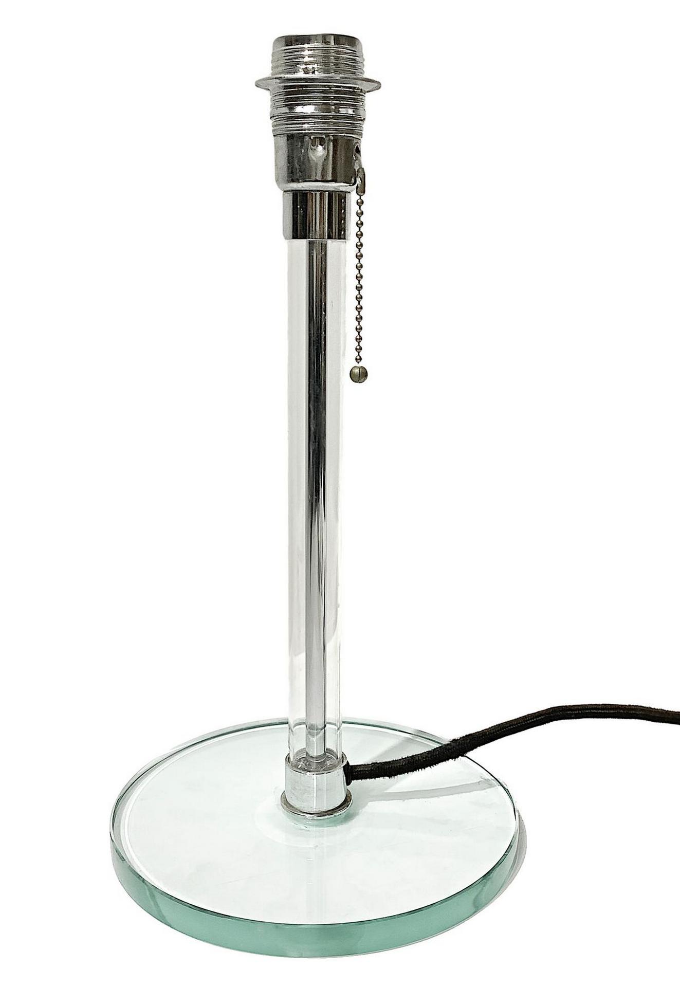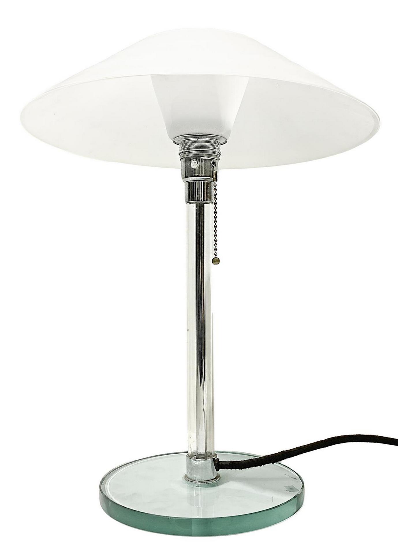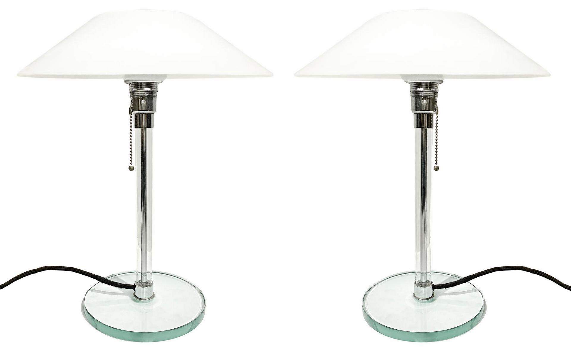 Coppia di lampade stile Wilhelm Wagenfeld. Struttura in vetro e metallo, diffusore in vetro bianco incamiciato. H cm 46 X20