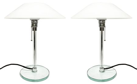 Coppia di lampade stile Wilhelm Wagenfeld. Struttura in vetro e metallo,...
