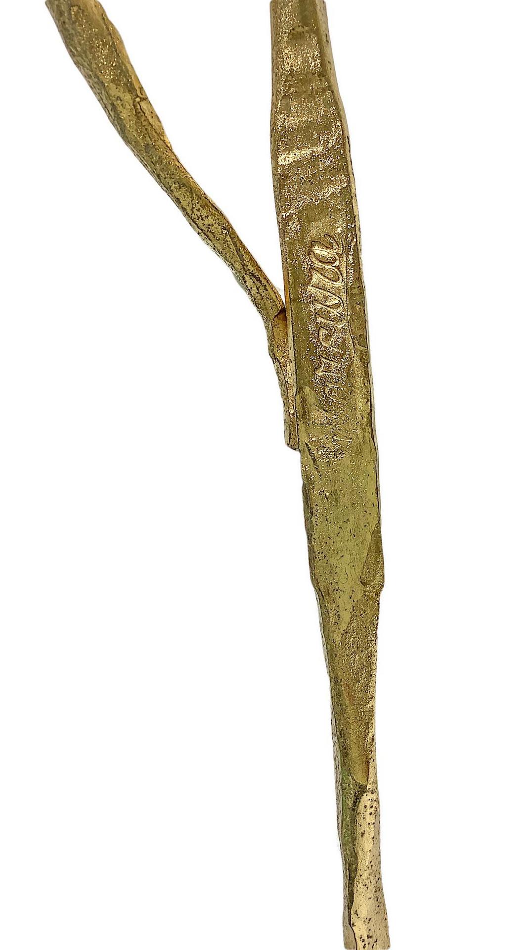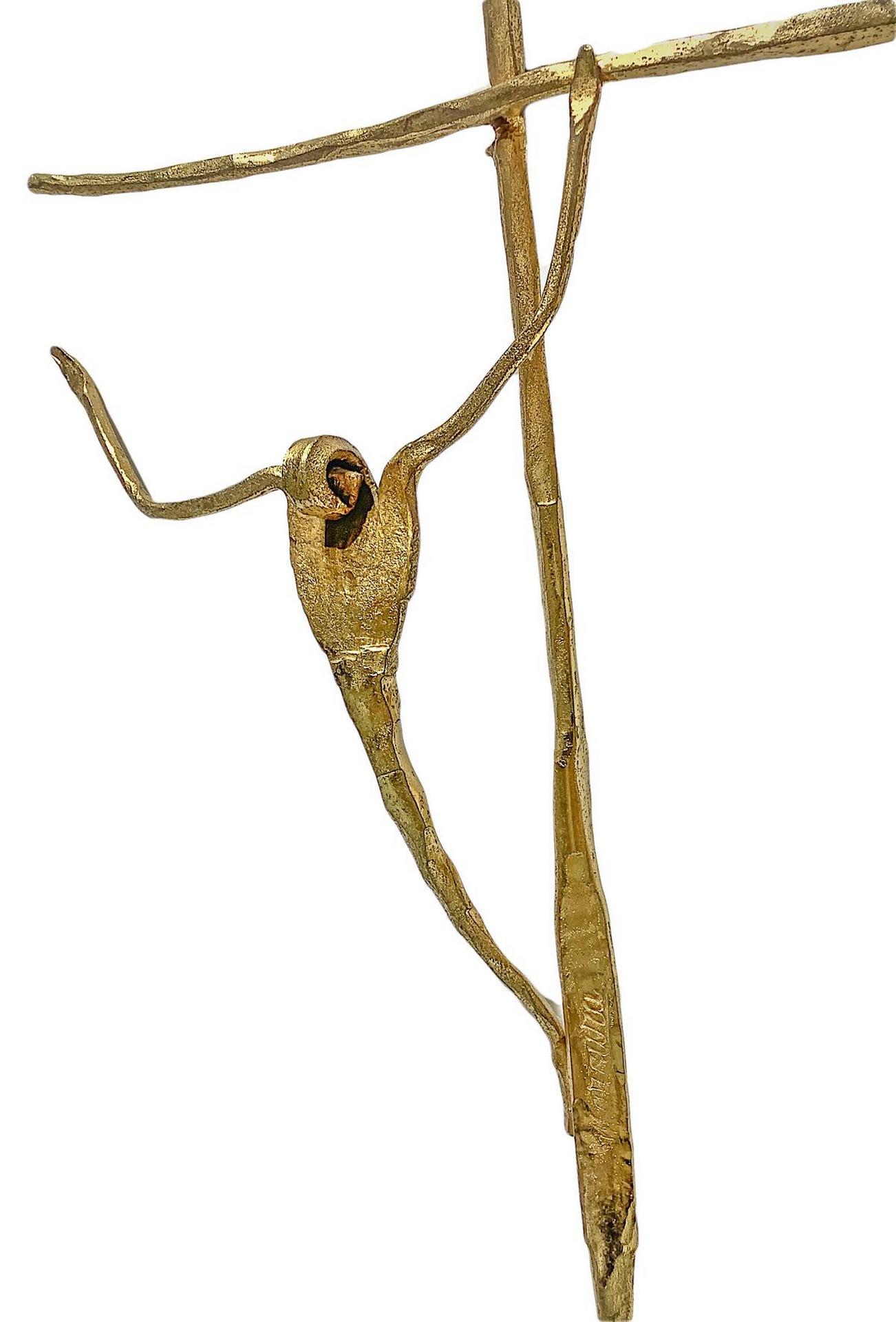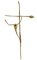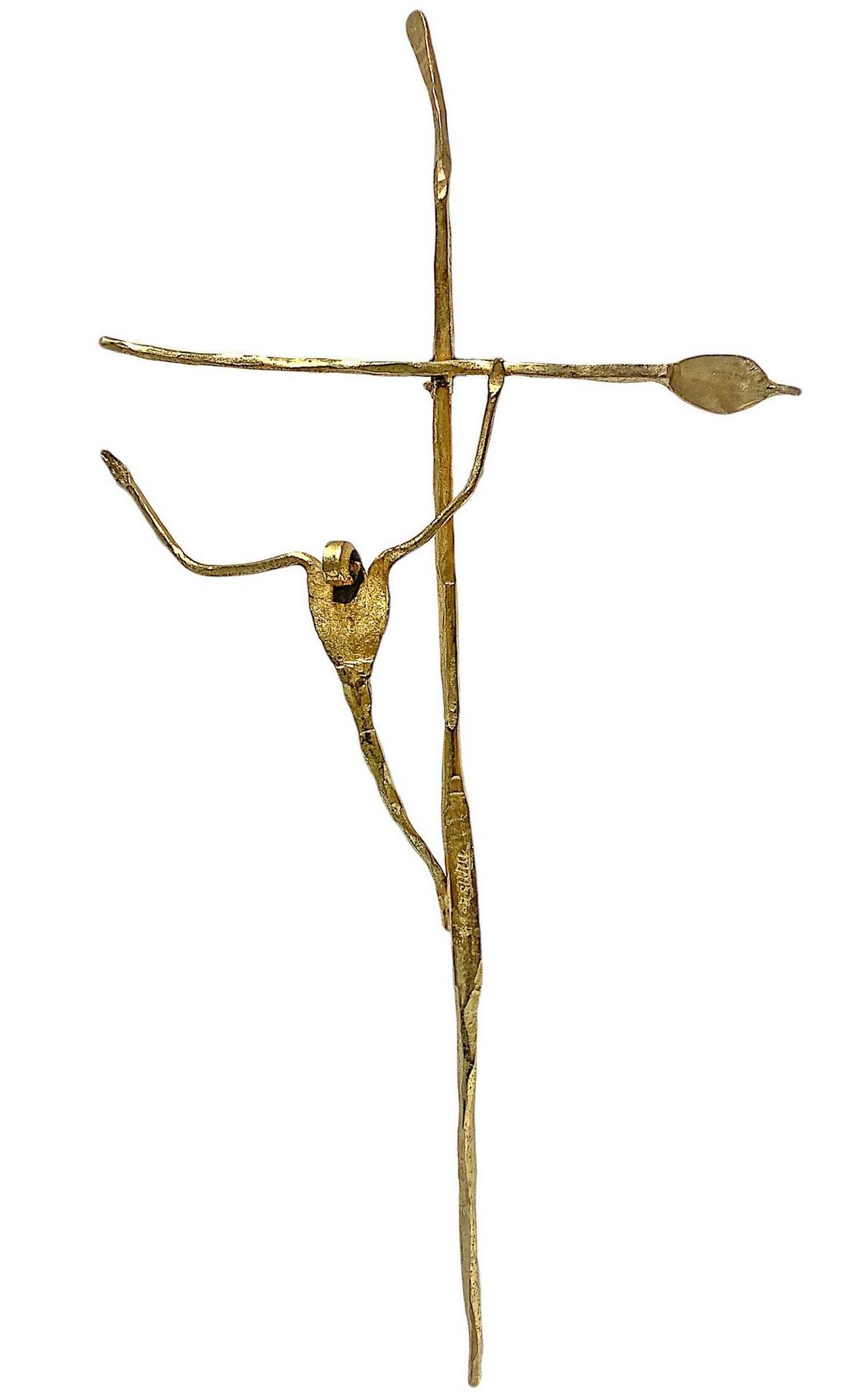 Crocifisso in ottone dorato di gusto informale, firmato sulla croce Warsura....