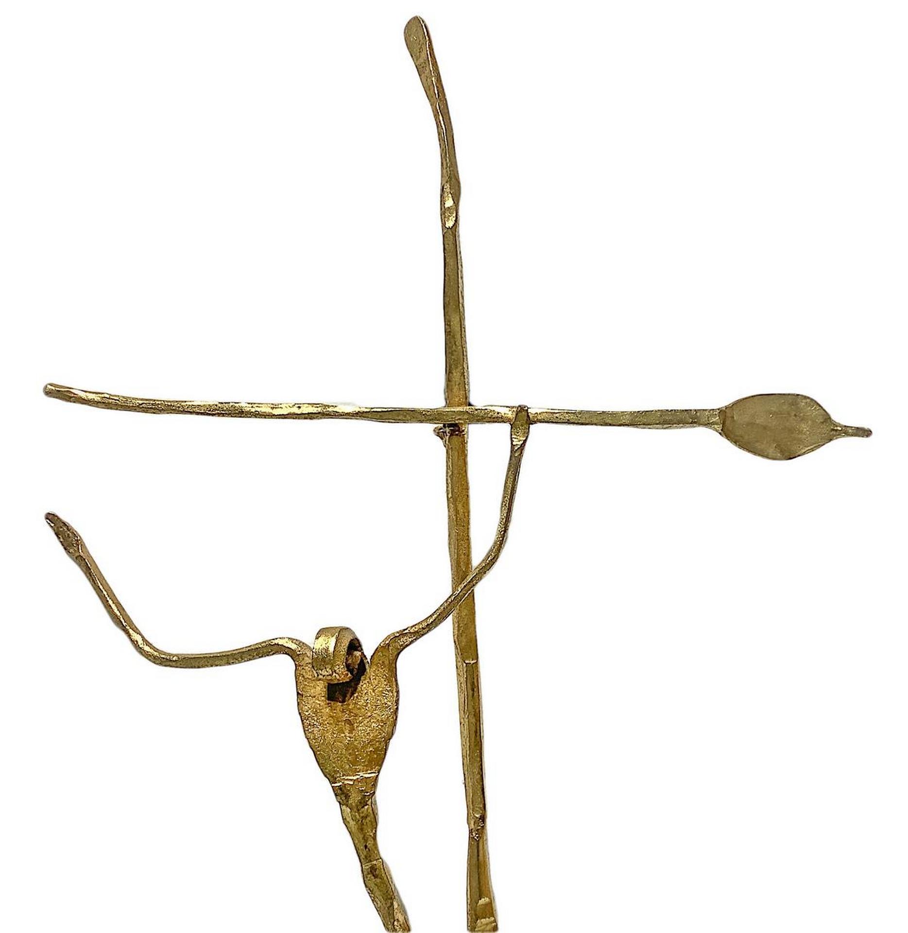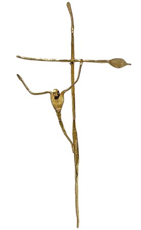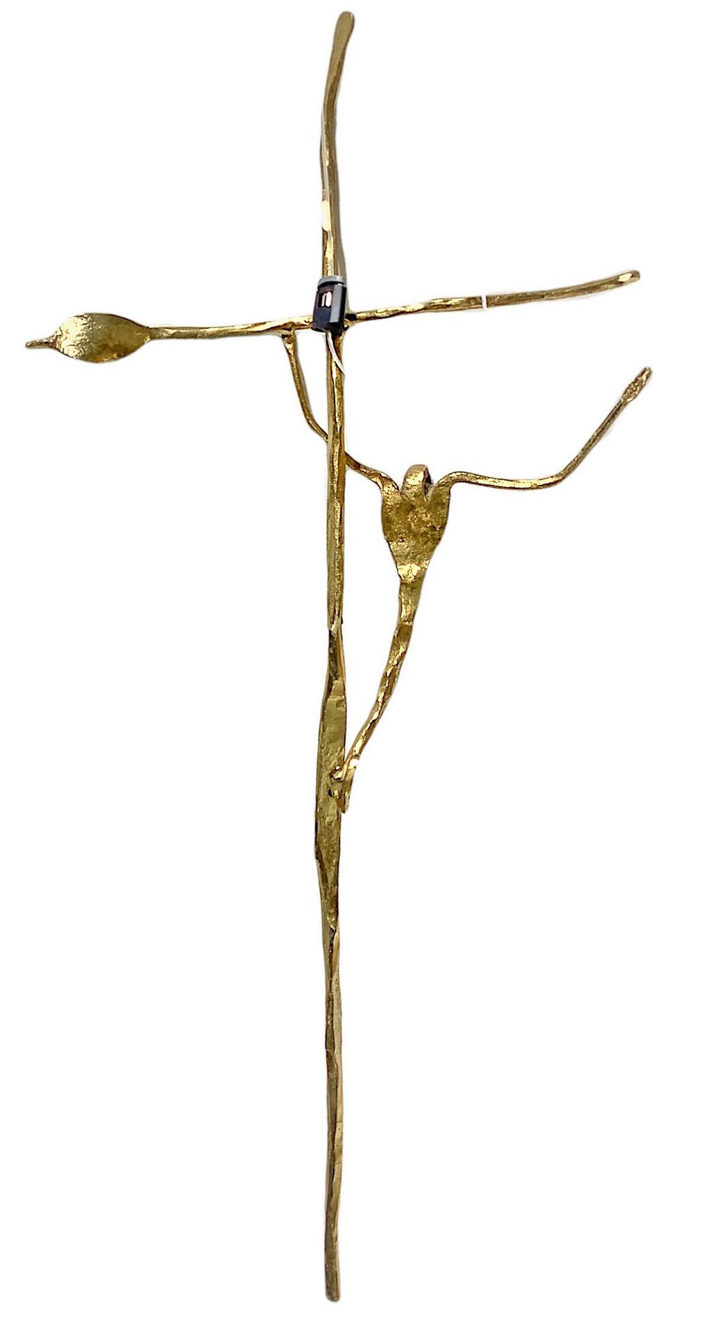 Crocifisso in ottone dorato di gusto informale, firmato sulla croce Warsura. H cm 77, larghezza cm 37