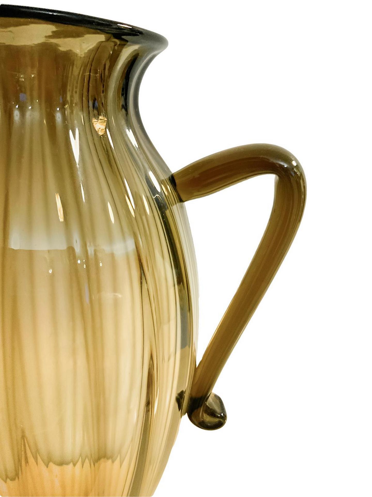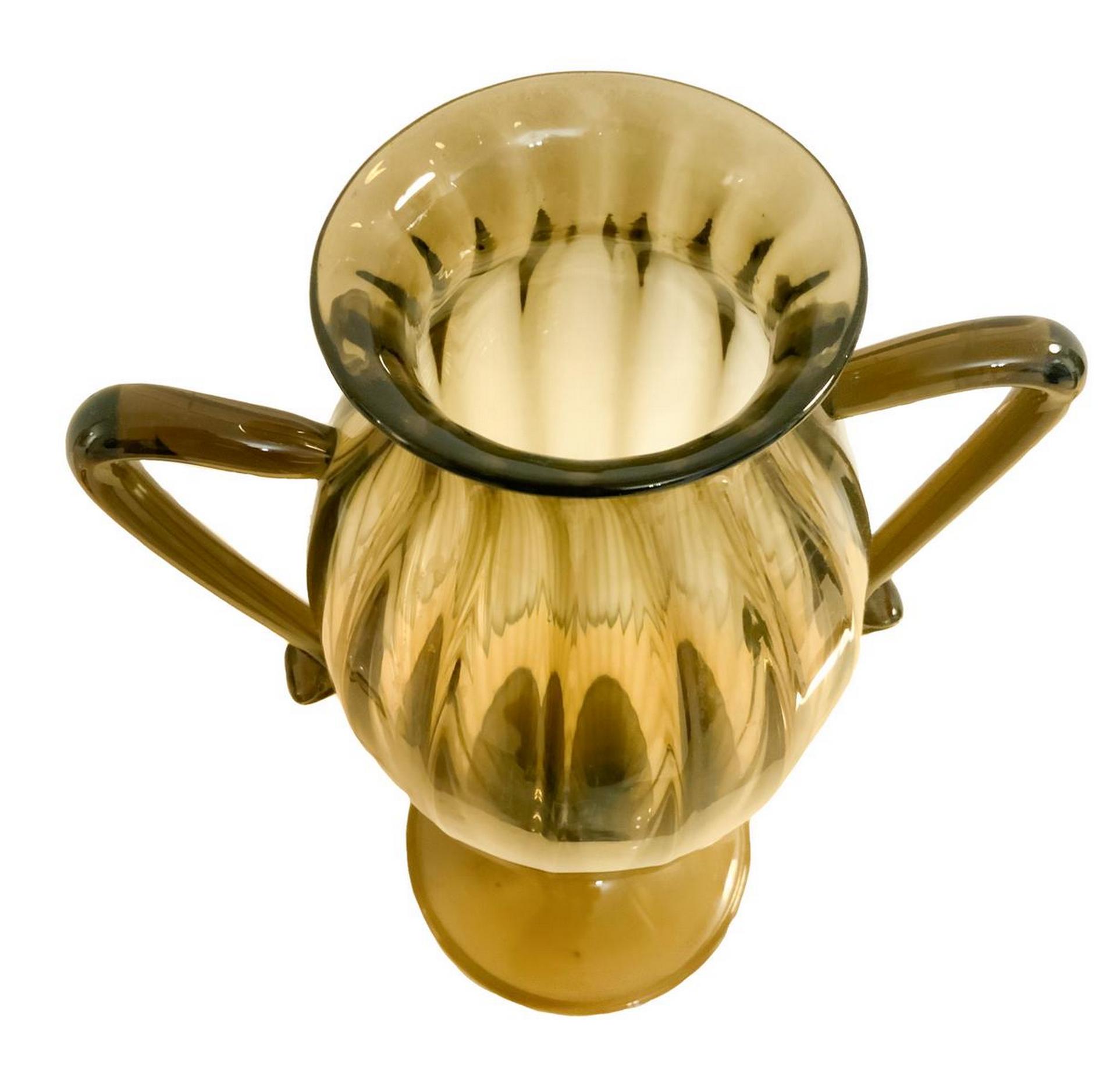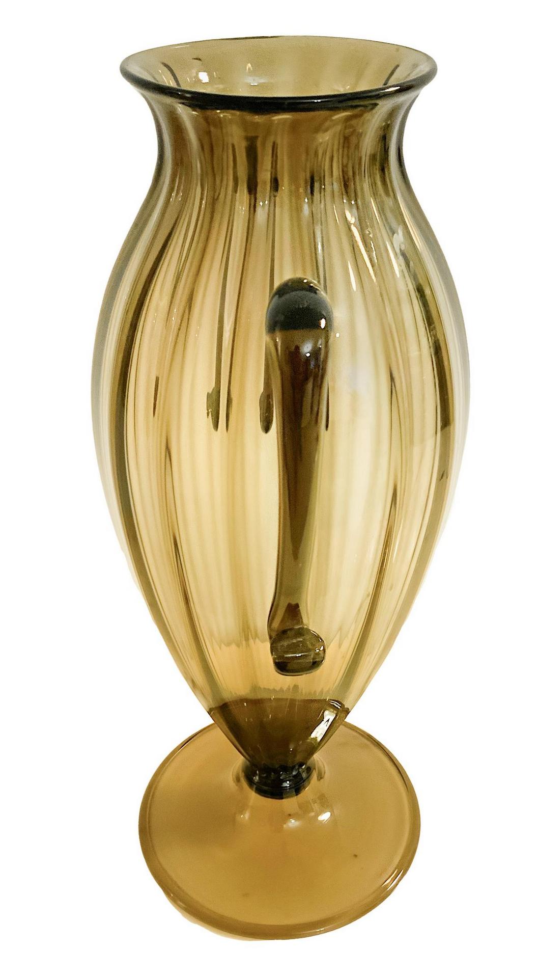 Produzione muranese nello stile di Vittorio Zecchin. Grande vaso in vetro soffiato a formadi balaustra nei toni del nero trasparente, anse applicate, base lenticolare estroflessione alla sommità. Anni '20. 43x26