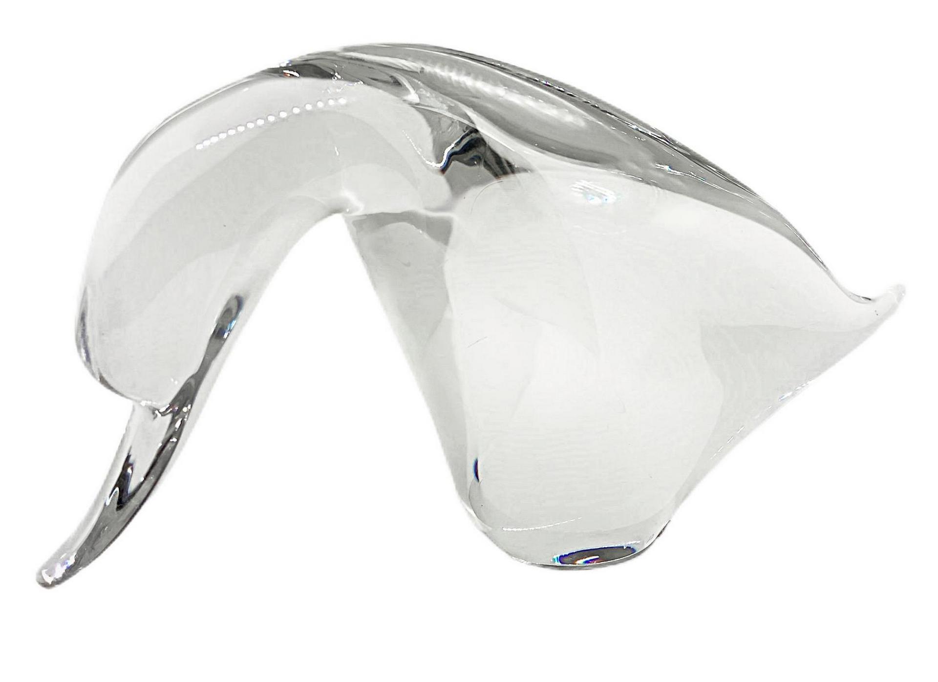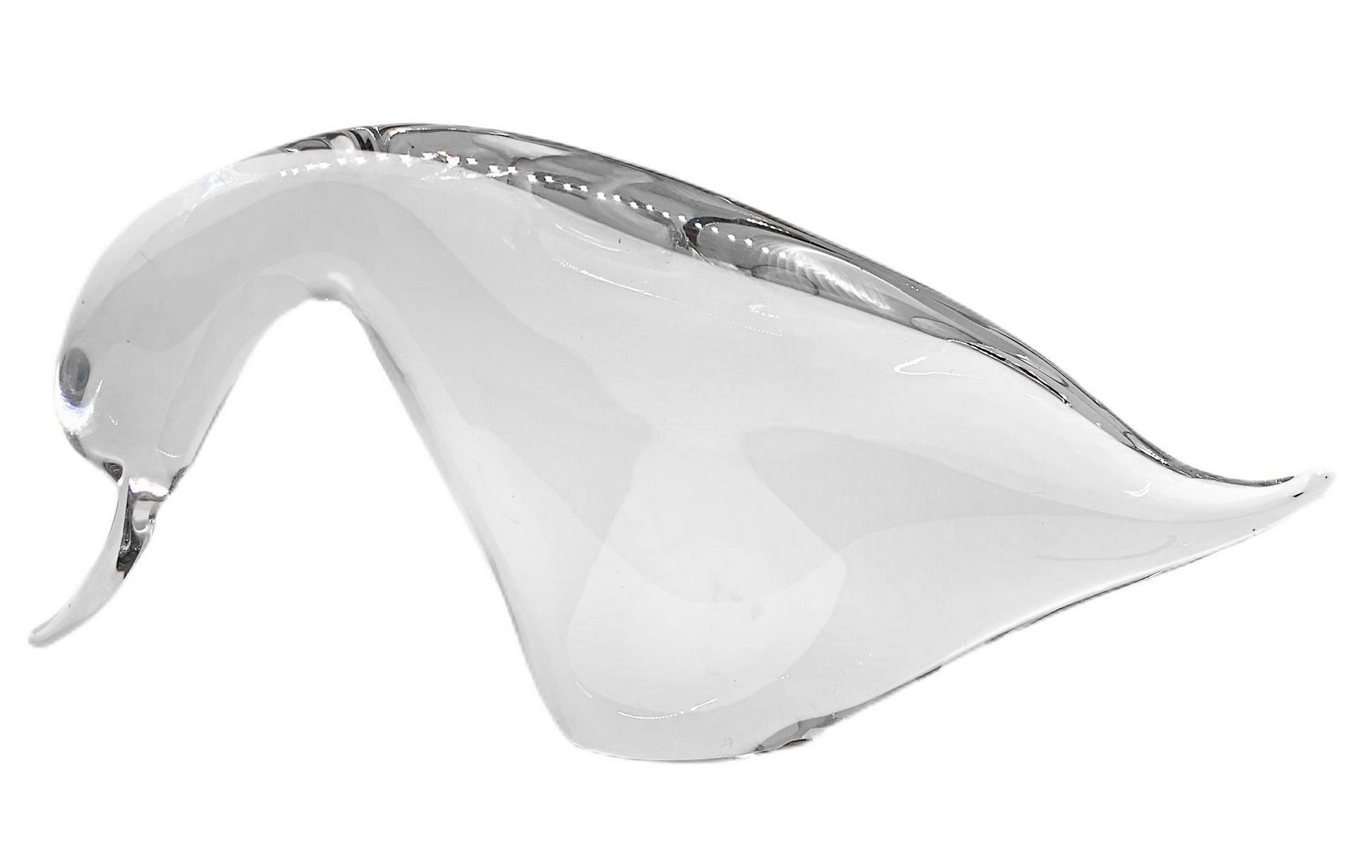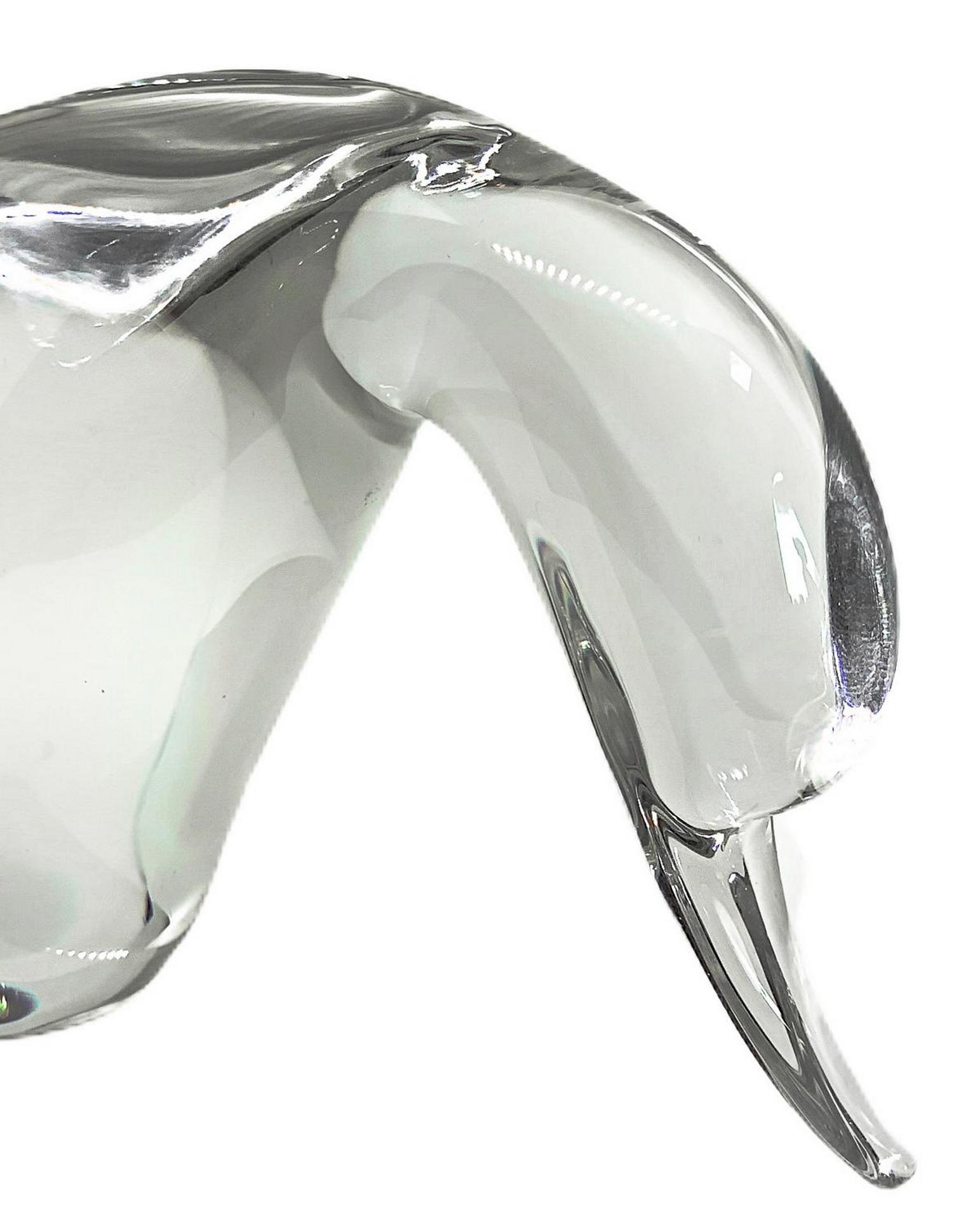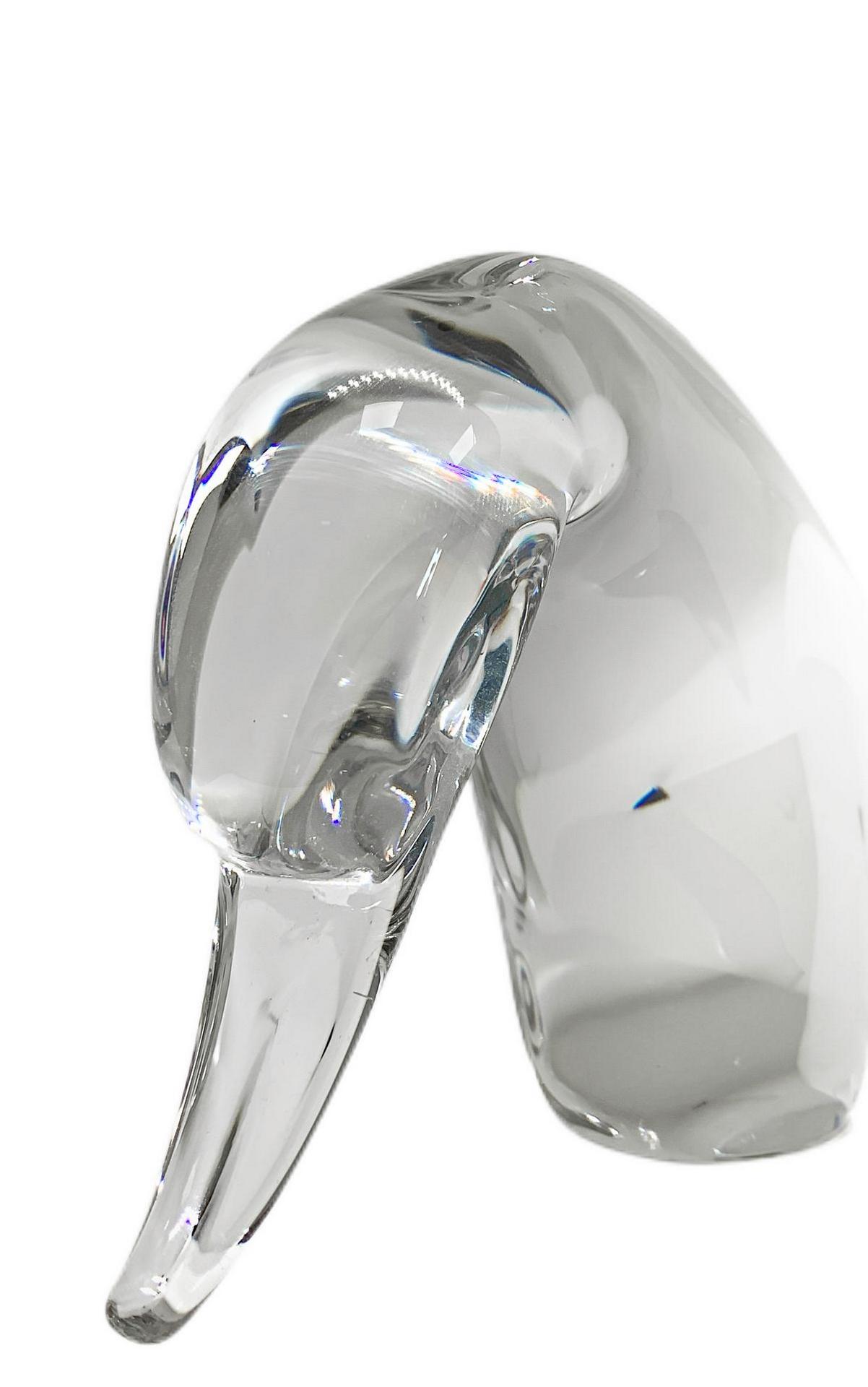 Scultura in cristallo di gusto informale raffigurante papera, XX secolo. H cm 12 x cm 24. Firmato sulla base.