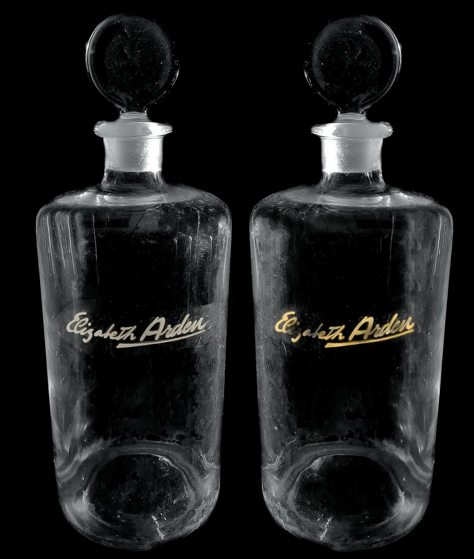Coppia bottiglie Elizabeth Arden, tonico Rosa. H cm 28. Marchio dell'azienda di cosmesi dalla Red Door, il cui primo salone di bellezza è stato inaugurato nel 1910 sulla mitica Fifth Avenue di New York, diventato oggi iconico Brand. Piccola sbeccatura sul collo di una.L