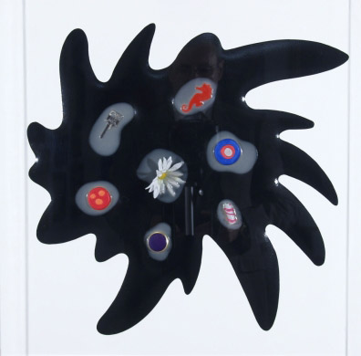 NUCARA RENZO (Crema 1955) “Bang 10-37” 2011 Legno, carta, colore serigrafico, resine e oggetti cm. 50x50 Firma al retro. A tergo dell'opera archivio n. 0114349. Autentica dell'autore su foto.