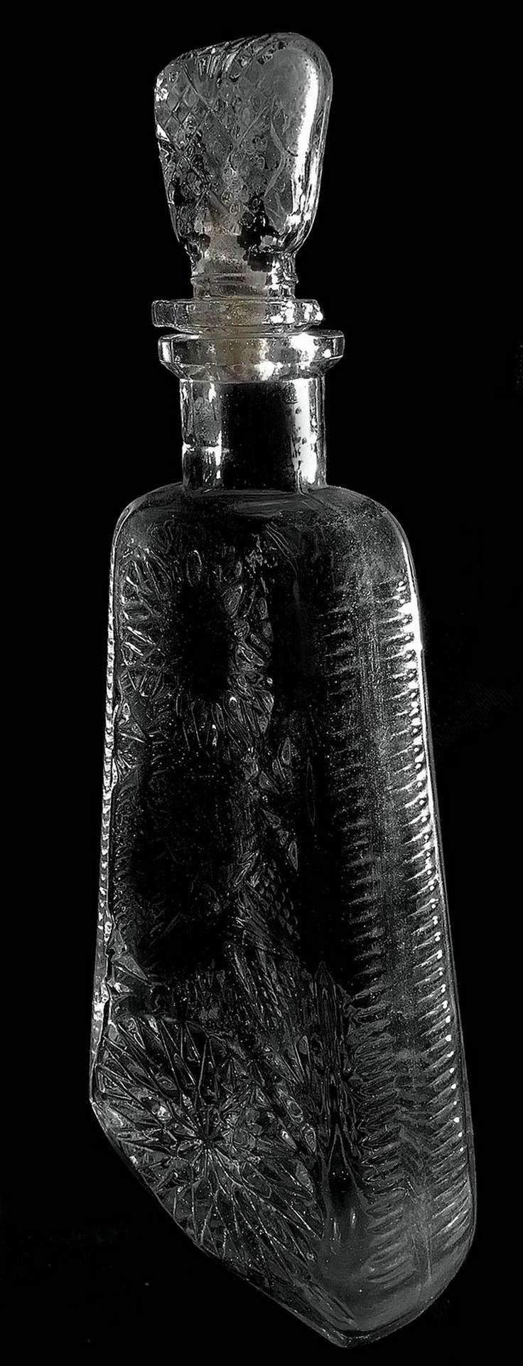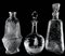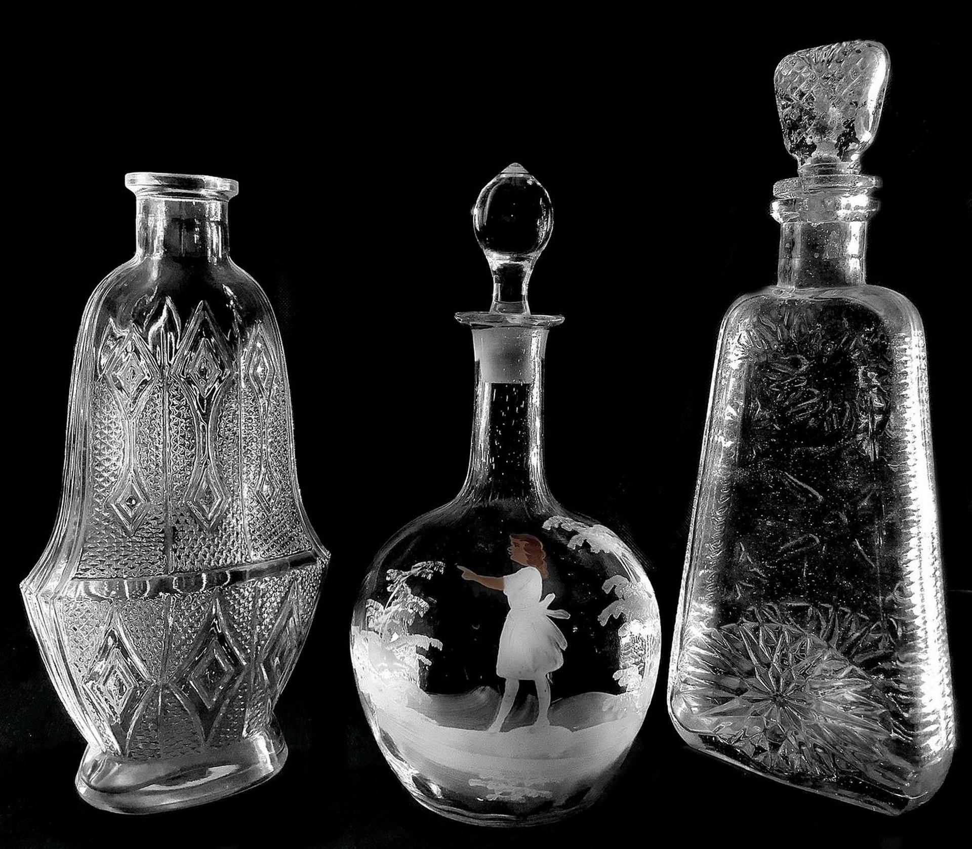 Gruppo di n. 3 bottiglie in vetro e cristallo, XX secolo. Vari formati e forme. Tappi adattati.