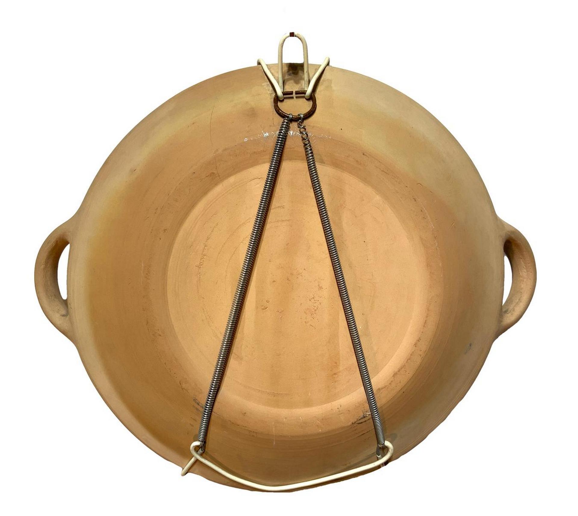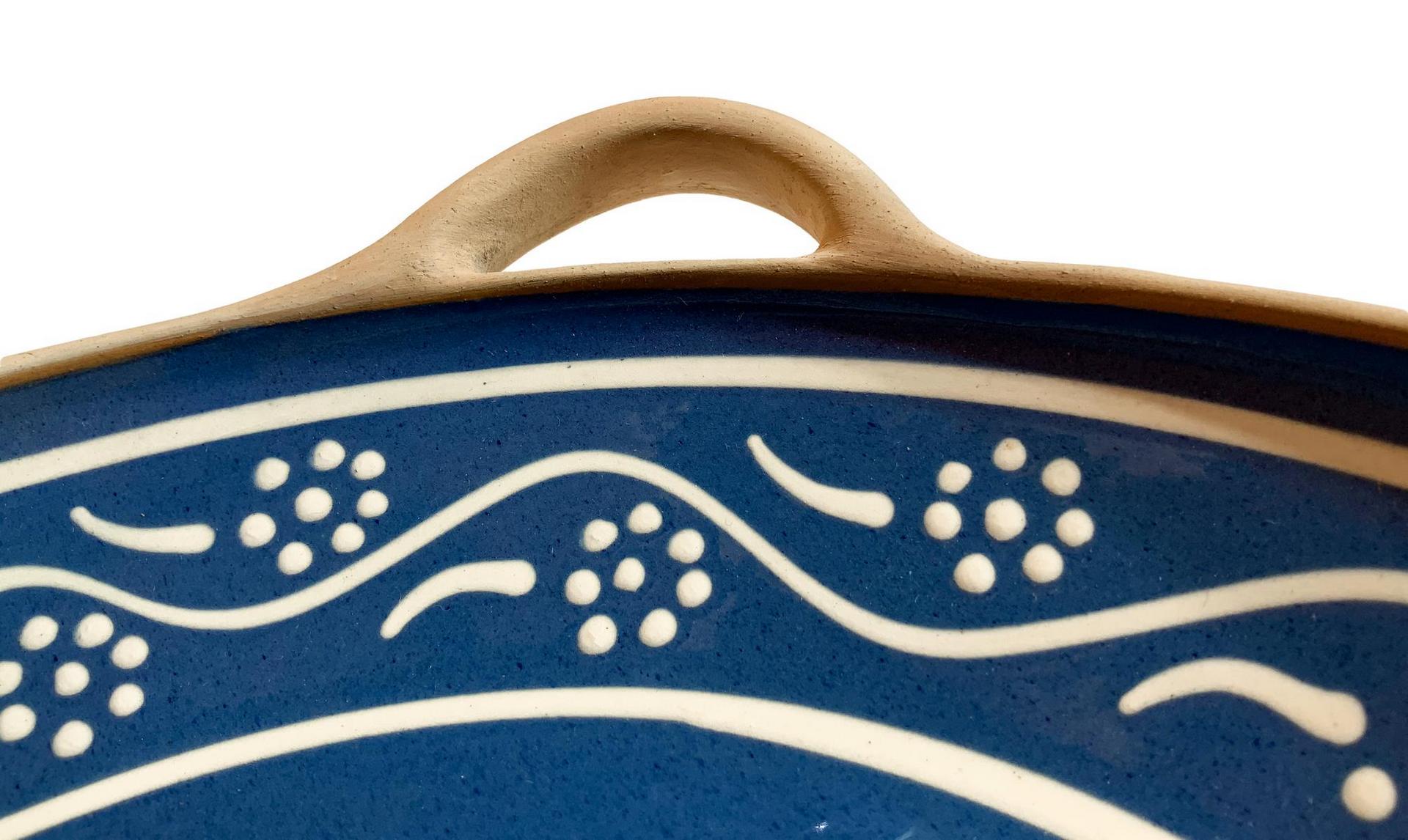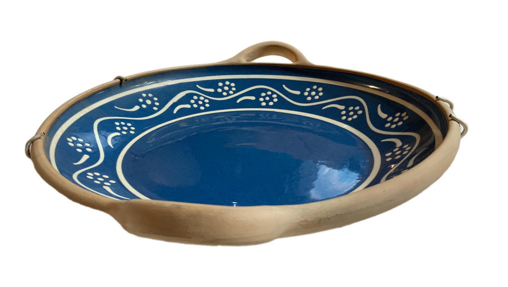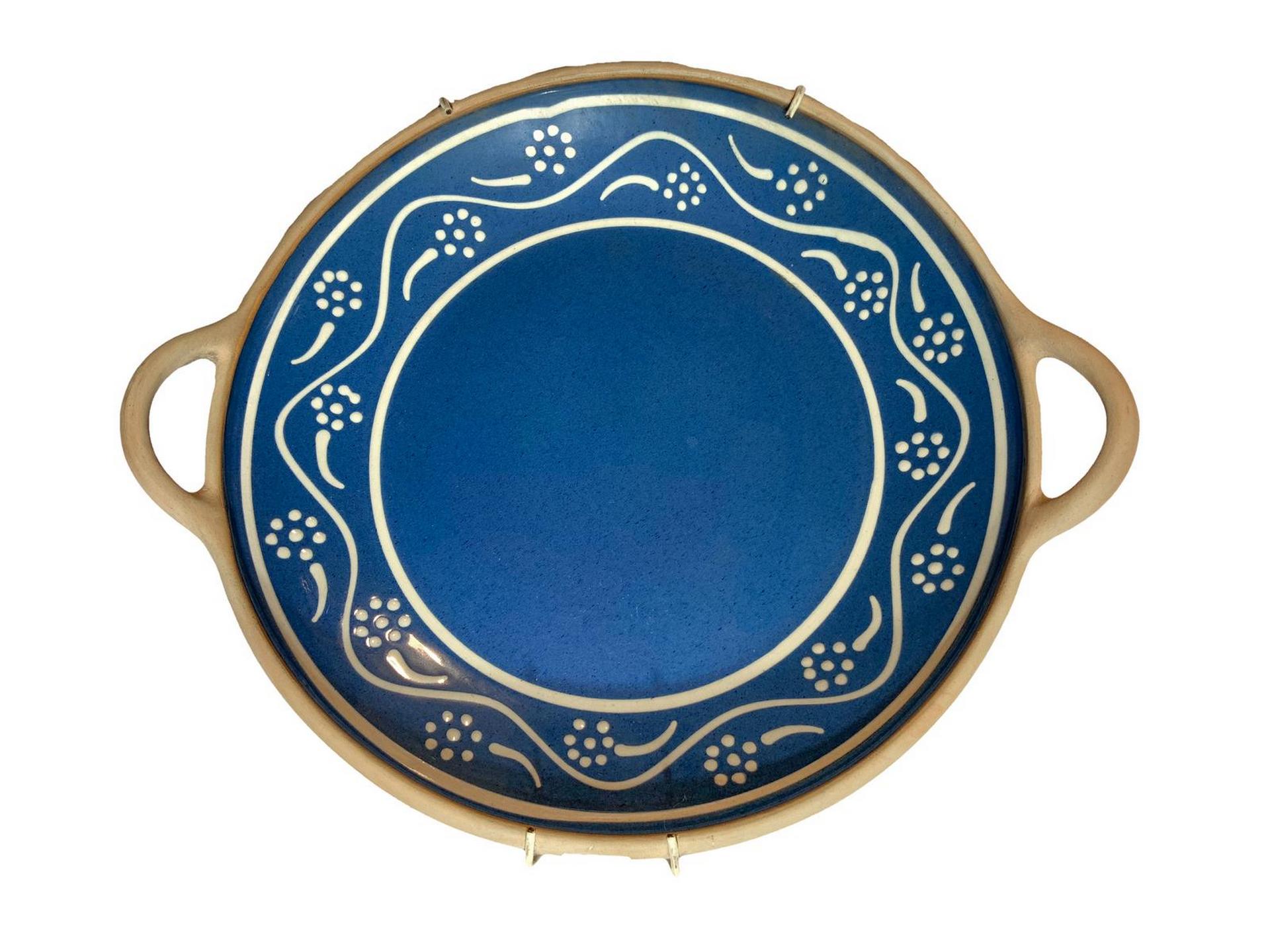 Scodella con manici, Tunisia. Decorata con fiori bianchi su sfondo azzurro. Cm 30