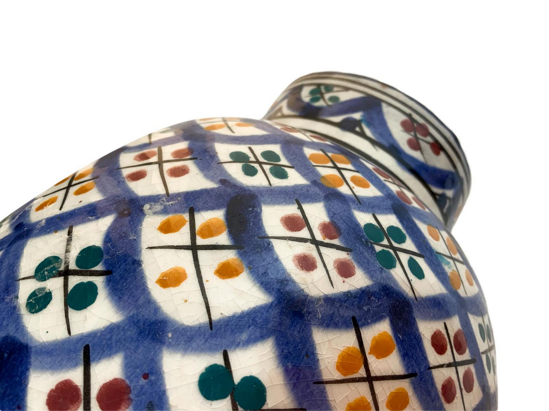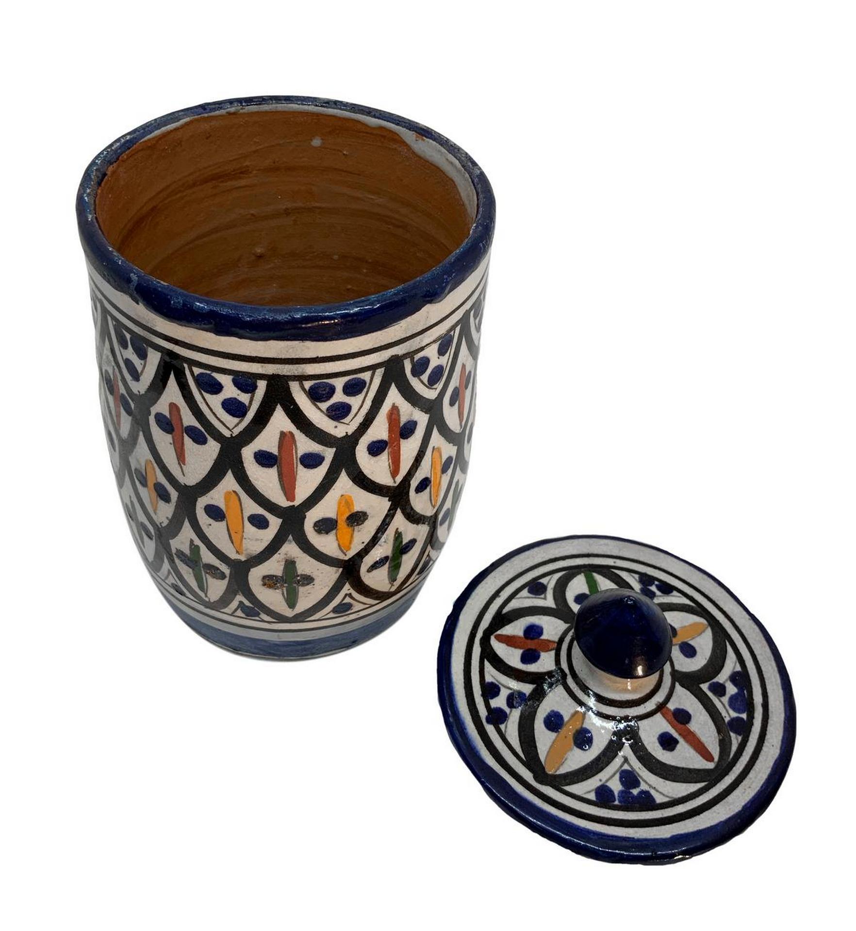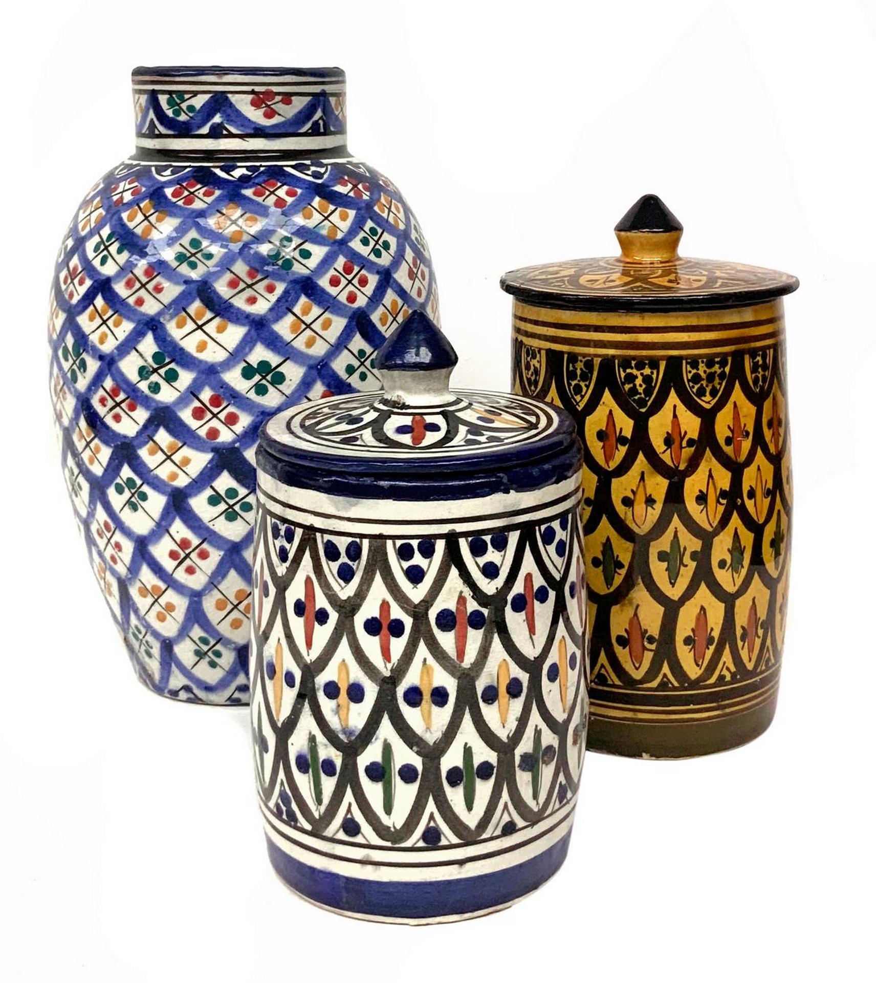 Gruppo di tre vasi, Tunisia. Due vasi con coperchio, H cm 15 e cm 20. Un vaso in ceramica, cm 28
