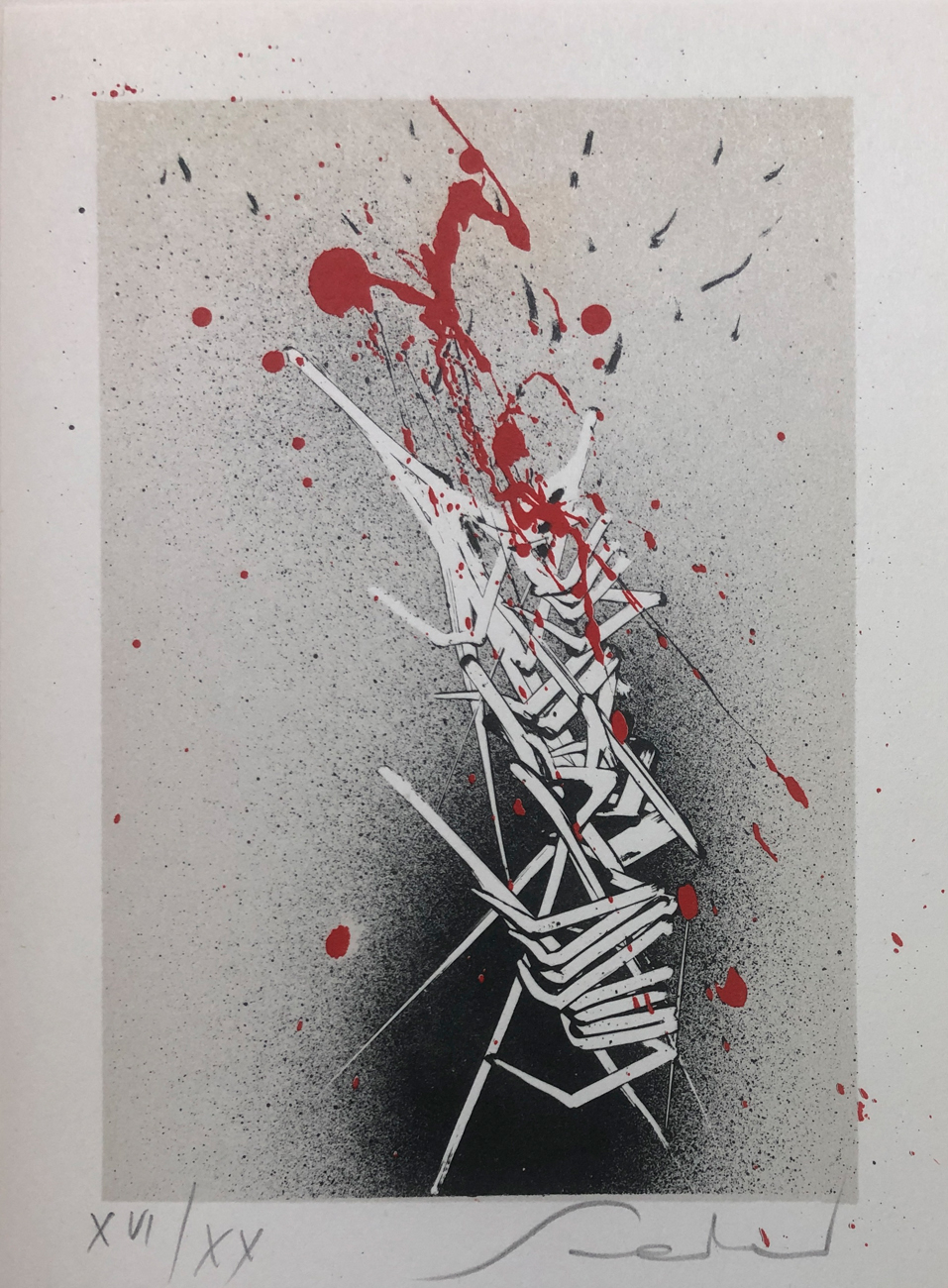 Piccolo cofanetto contenente una serigrafia di Emilio Scanavino recante firma e numerazione (Esemplare XVI/XX) a matita al fronte e un testo di Roberto Sanesi