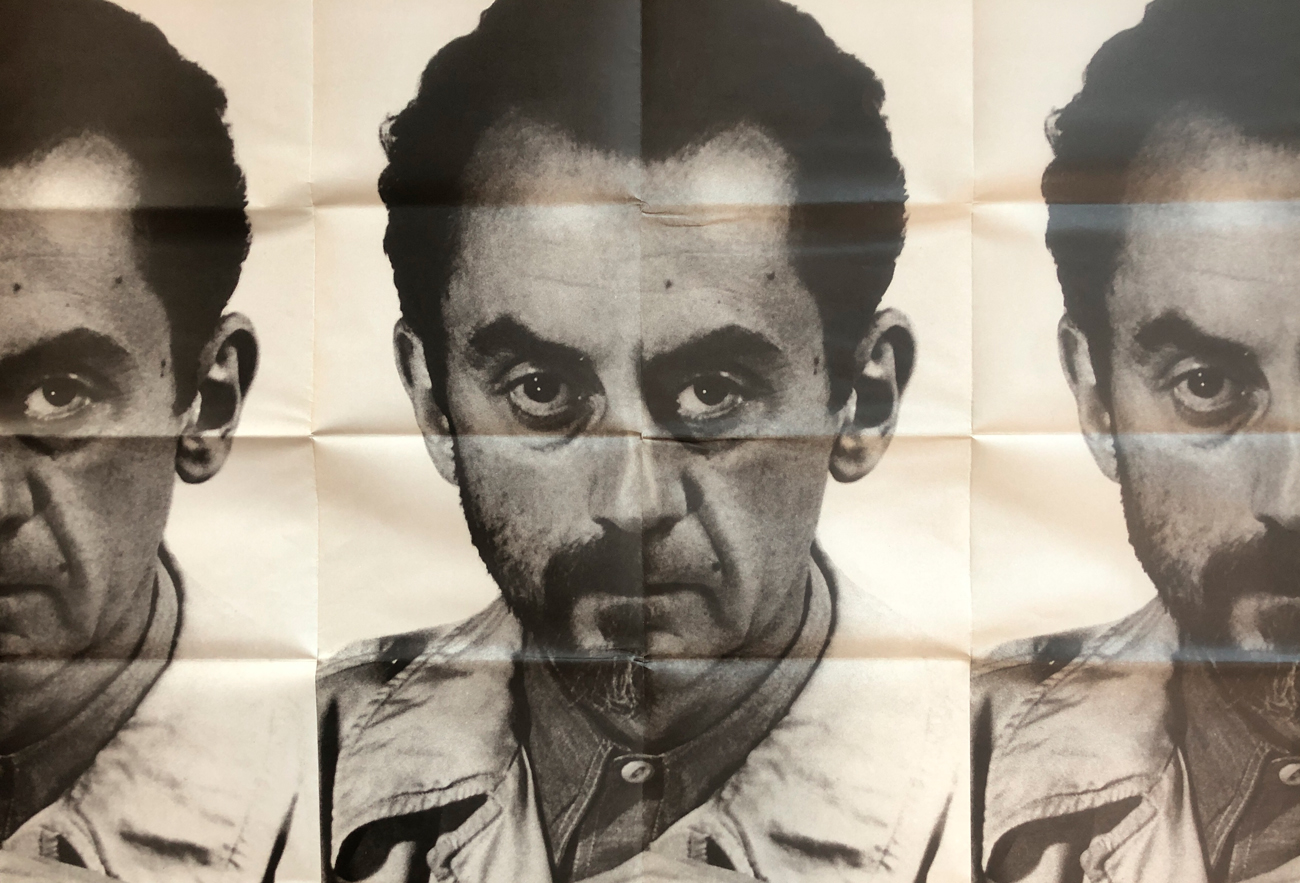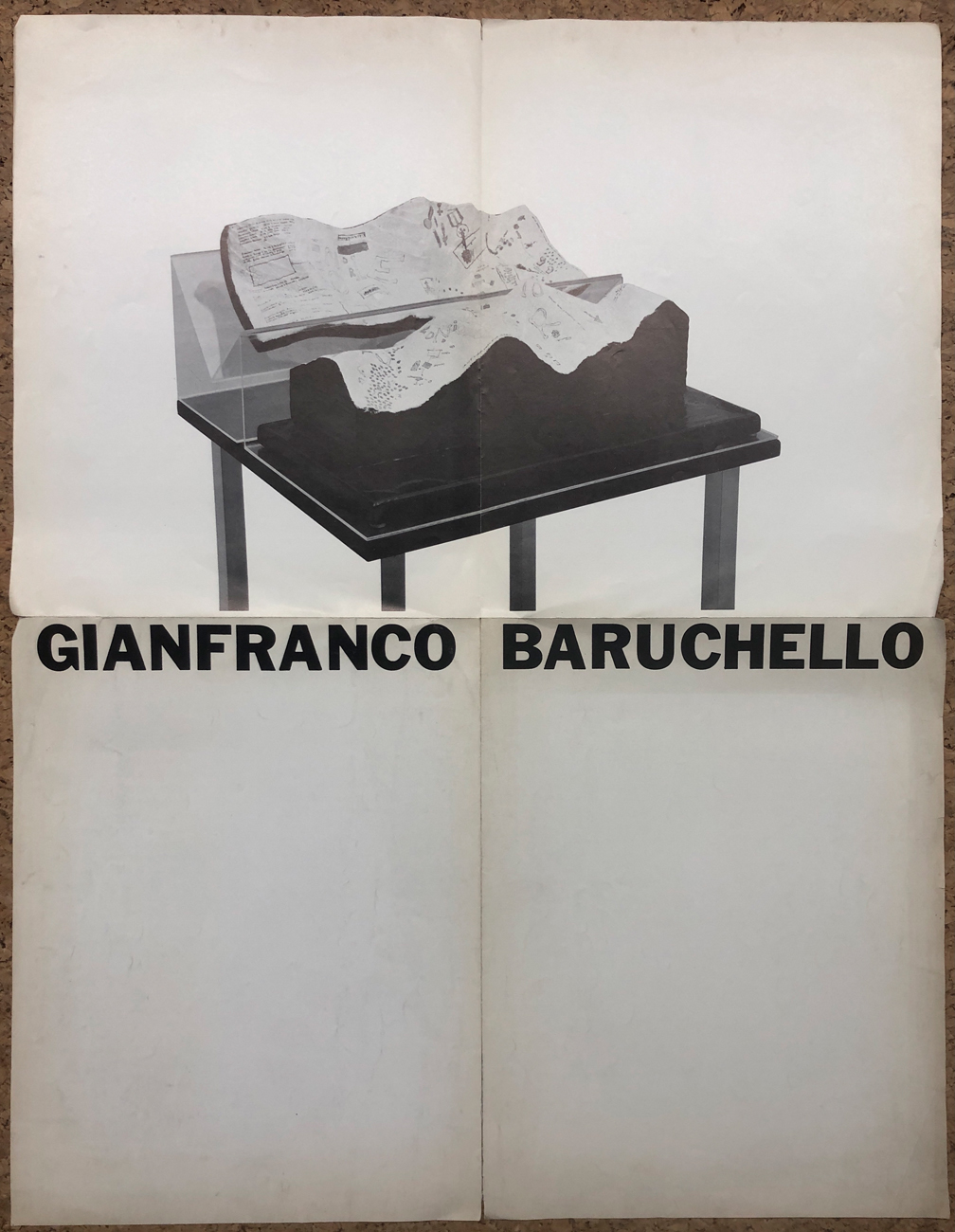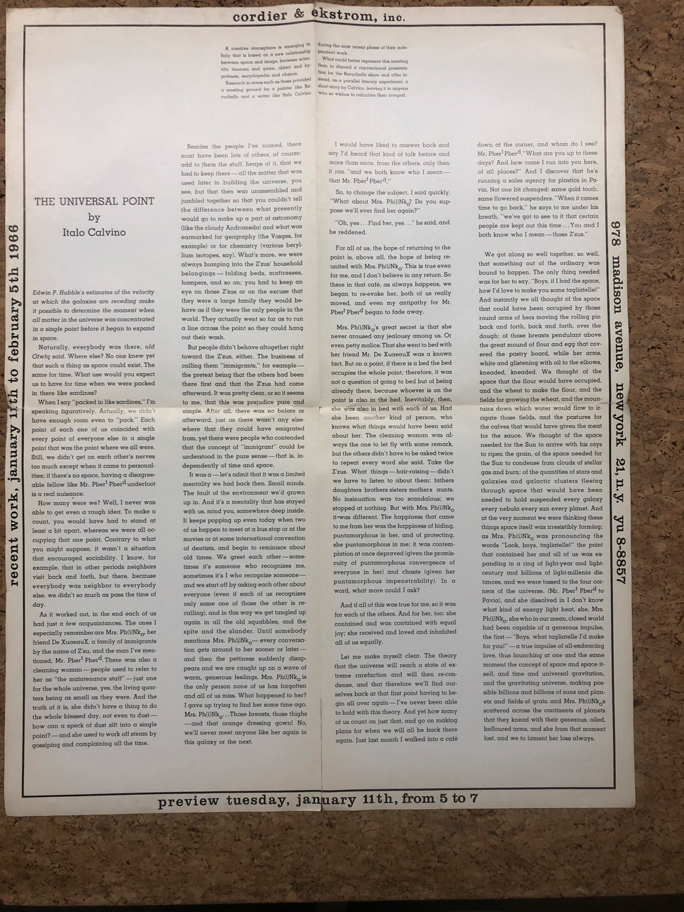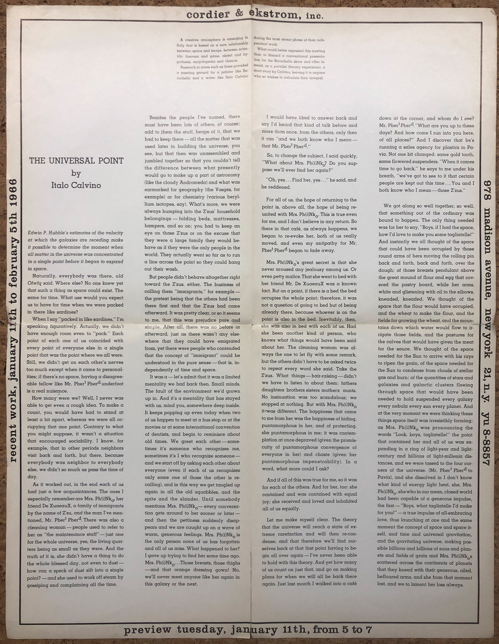 La locandina riproduce un'opera dell'Artista al fronte e un testo in inglese di Italo Calvino al retro