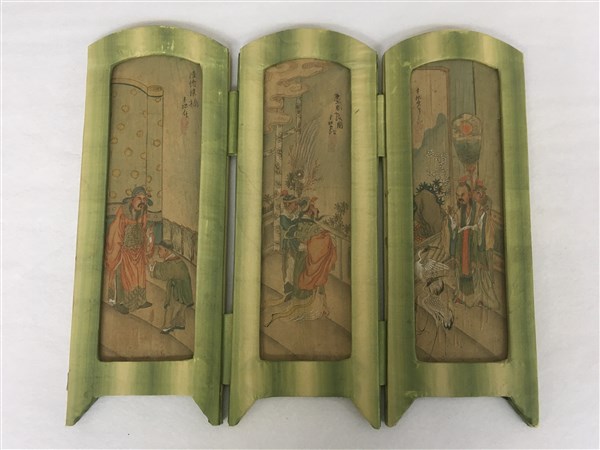 Piccolo paravento da tavolo a tre ante dipinte a colori su seta con immortali e figure leggendarie