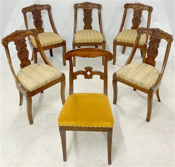 Lotto composto da cinque sedie a gondola con sedute asportabili e una sedia con schienale a giorno di fattura differente. Secolo XIX (difetti)