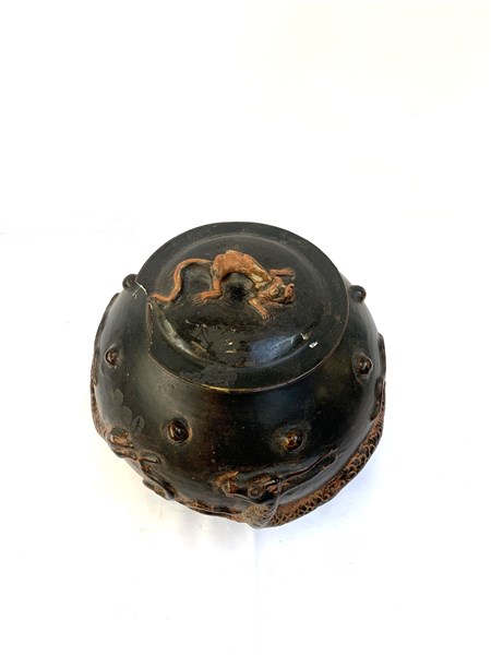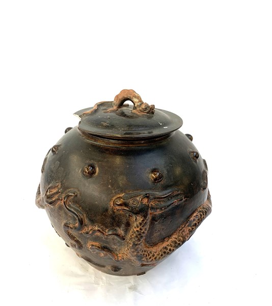 Giara con coperchio in ceramica a patina scura, decorata a rilievo da serpente (difetti)