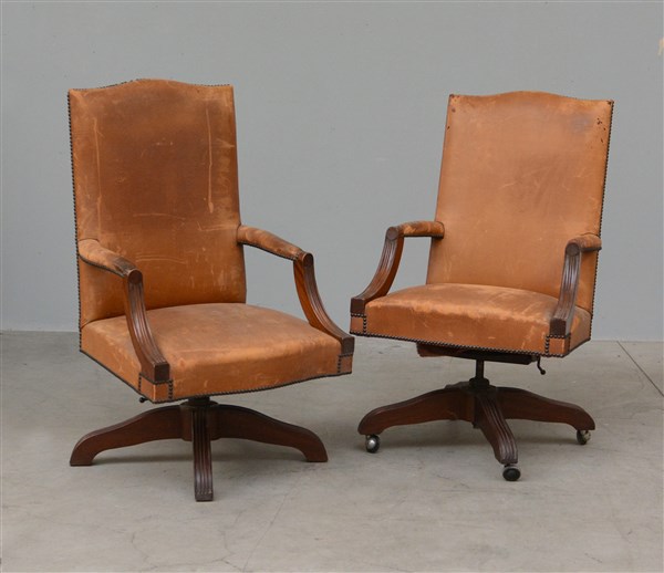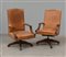 Coppia di poltrone da ufficio girevoli con struttura in legno, rivestimento in cuoio. (cm 61x108x65) (difetti e mancanze)