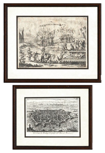[MODENA] Lotto di due incisioni del XVIII entro cornici in legno moderne di Modena: "La città di Modena capitale del Ducato Modenese" tratta da "Lo Stato presente di tutti i paesi e popoli del mondo” stampata a Venezia da Albrizzi (c.a 1750), CON: "Carroccio de Modenesi" tratto da "La Secchia Rapita" stampato a Modena da Soliani nel 1744.