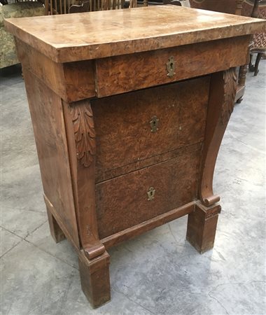 Comodino a tre cassetti lastronato montanti sagomati intagliati a motivi vegetali, piedi a pilastro, secolo XIX (cm 57x83x42) (difetti e restauri)