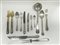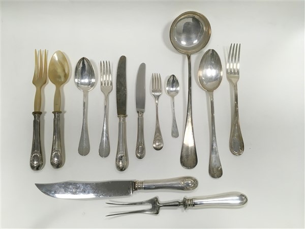 Servizio di posate in argento a corpo liscio. Composto da dodici cucchiai con forchette e coltelli, dodici forchette da frutta con coltelli e dodici cucchiai da dolce, sette posate a servire di cui due con parti in corno. Titolo 800 (g 3000 circa) (difetti)