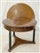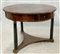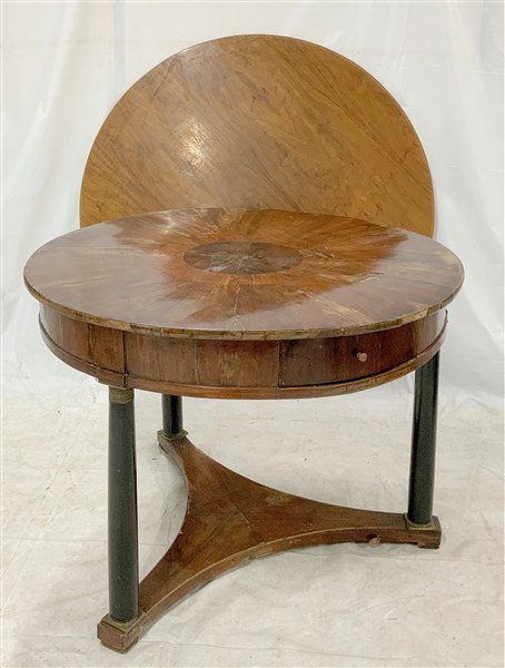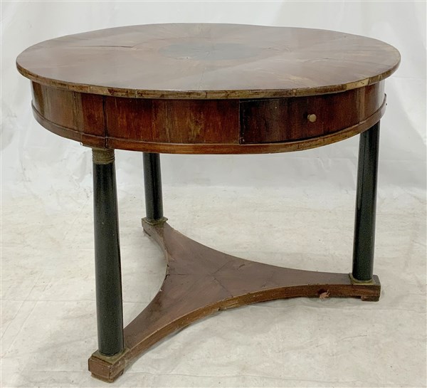 Tavolo tondo lastronato in noce con tre cassetti nella fascia, sorretto da tre gambe a colonne ebanizzate riunite da crociera, capitelli in bronzo. Secolo XIX (d cm 106x80), unito ad piano circolare di copertura non pertinente (difetti e mancanze)