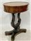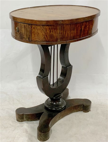 Tavolino ovale lastronato a due cassetti nella fascia e sostegno a lira poggiante su gambe a mensola sagomate. Secolo XIX (cm 59x76x48) (difetti e mancanze)