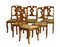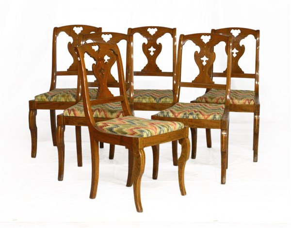 Gruppo di sei sedie filettate in legno chiaro, schienale a giorno traforato, gambe anteriori sagomate, sedute rivestite in tessuto fiammato, secolo XIX (difetti e restauri)