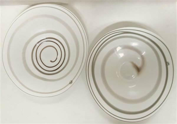 Lotto di due centrotavola di forma ovale in vetro lattimo con decoro a spirale (cm 43x40) (lievi difetti)