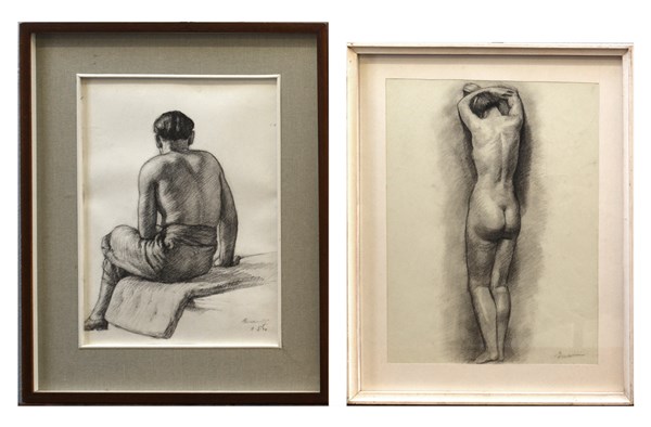 Lotto di due disegni a matita raffiguranti "Nudi di schiena" (misure diverse) Firmati; uno dei due datato 18-4-30. In cornici