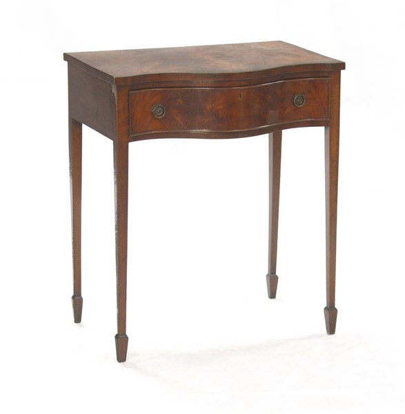Tavolino ad un cassetto con piano sagomato e lastronato in mogano, gambe rastremate, Inghilterra fine secolo XIX (cm 62x73x43) (difetti)