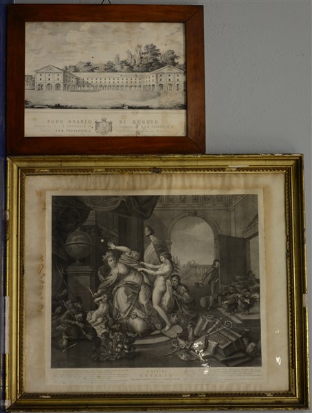 Lotto composto da due incisioni di cui una con scena allegorica in cornice dorata. fine sec. XVIII, la seconda raffigurante il Foro Boario di Reggio in cornice di noce (entrambe con difetti).