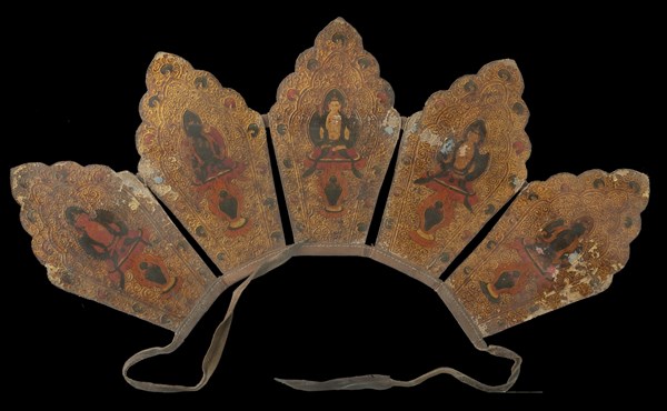 A polychrome ritual Tibetan five buddhas crown, composed of five elements attached by a leather band for wearing (defects)