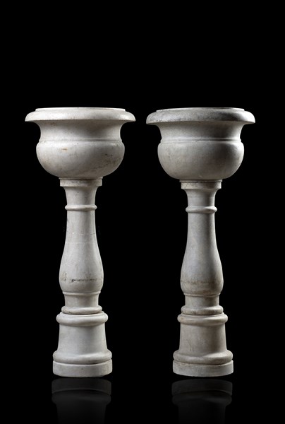 Coppia di vasche in marmo, sostegno in marmo tornito, poggianti su basi circola