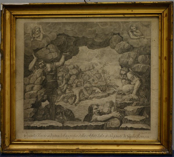 ROMANO, Giulio [inv.] , VIVIANI, Joa D. [sculp.] - Quarta parete a destra dell ingresso della celebre Sala de' Giganti di Giulio Romano. Presumibilmente da "Seconda Parete, al prospetto della celebre Sala de' Giganti di Giulio Romano", inizio XIX (480 x 570 - misura entro cornice) (difetti).