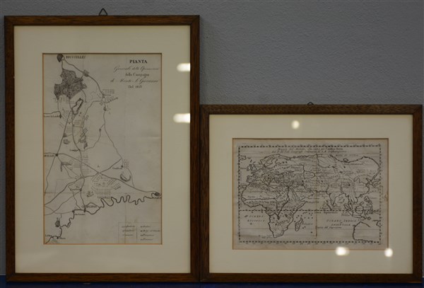 Lotto composto da due carte geografiche in cornice di cui "Pianta generale delle operazioni della campagna di Monte San Giovanni nel 1815", con legenda e mappa di studio dal titolo "Mappa del Mondo, che serve per l'antica storia del P. du Val Geografo [...]", menzione a Pierre Duval (1618–1683), con alcune note manoscritte (entrambe con lievi difetti).