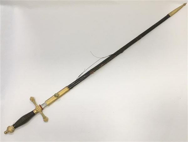 Gladio da dignitario del Regno di Spagna. Impugnatura in corno lavorato a tortiglio con inserimento di filo metallico nelle varie giraglie. Pomolo di codolo con monogramma di Alfonso XIII, guardia a "T" con al centro Stemma del Regno di Spagna. Lama in acciaio firmata Toledo a losanga, fodero con puntale ed innesto in bronzo dorato, pelle danneggiata. Spagna, fine secolo XIX/ inizi secolo XX (l. cm 92) (difetti)