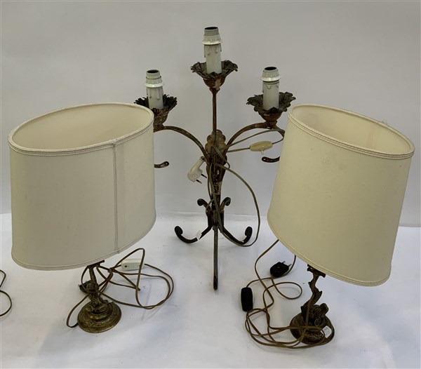 Lotto composto da cinque lampade da tavolo in metallo dorato e ferro battuto di