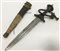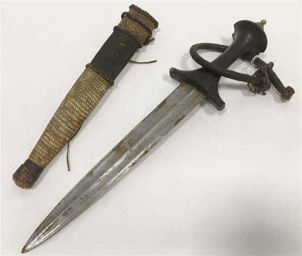 Pugnale da braccio con impugnatura in corno, lama a doppio taglio con costolatura centrale. Fodero in cuoio ricoperto in parte da pelle di serpente. Africa centrale, fine ecolo XIX(l. cm 36) (lievi difetti)