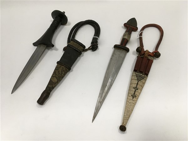 Lotto composto da due pugnali da braccio, uno con impugnatura rivestita di pelle rossa e lama a doppio taglio con costolatura centrale, fodero in cuoio rosso arricchito da parti in pelle di serpente (h. cm 33) e l'altro con impugnatura in corno, lama a doppio taglio con costolatura centrale, fodero in cuoio operato con parti in pelle di serpente (h. cm 30). Africa centrale, finizi secolo XX (usura del tempo)