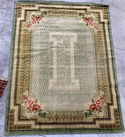 Tappeto meccanico Liberty, fine XIX secolo. Decoro con mazzi di fiori agli angoli. Medaglione centrale rettangolare su campo color verde. Probabilmente ridotto nella lunghezza. (Difetti, tagli e rapature) (cm 225x157)