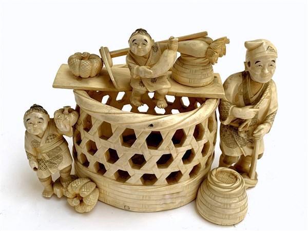 Composizione in avorio raffigurante fanciulli su un cesto con frutti, unito ad un netsuke e ad un avorio scolpito a forma di sacco