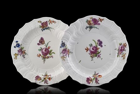 Manifattura di Vienna, fine secolo XVIII. Coppia di piatti in porcellana con bordo mistilineo decorata in policromia a fiori sparsi (d. cm 36) (difetti)