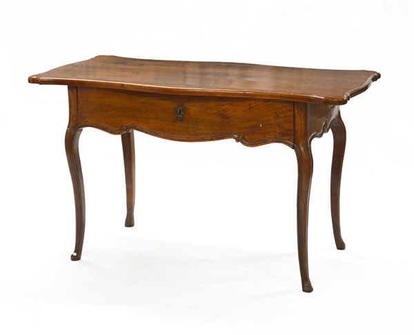 Tavolo in noce con piano sagomato, un cassetto nella fascia, gambe mosse, secol