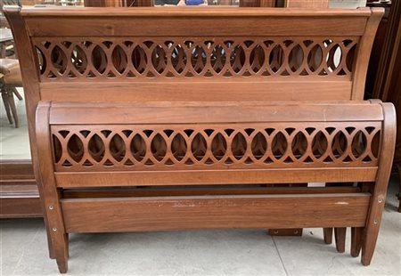 Coppia di letti con testate e pediere traforate a motivi geometrici (difetti)