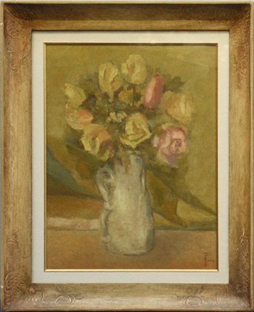 "Vaso di fiori"1947, olio su cartone (cm 50x40) Firmato e datato in basso a destra. Al retro: firmato. In cornice
