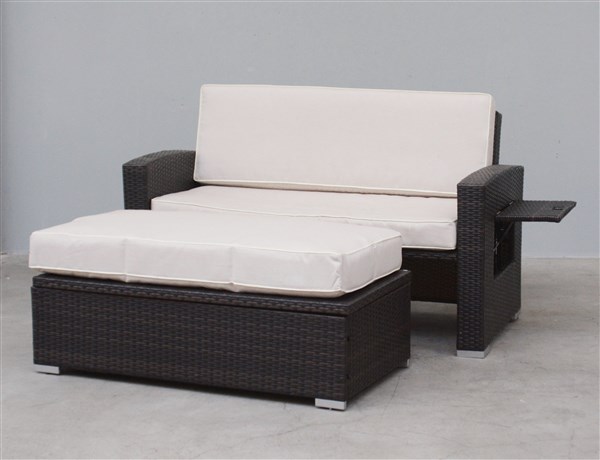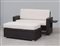 Lotto composto da un divanetto a due posti ed un pouff contenitore a finto vimini intrecciato con cuscini imbottiti e rivestiti in tessuto beige. Cina, produzione recente. (divanetto cm 140x81x75; pouff cm 58x34x113,5) (difetti)